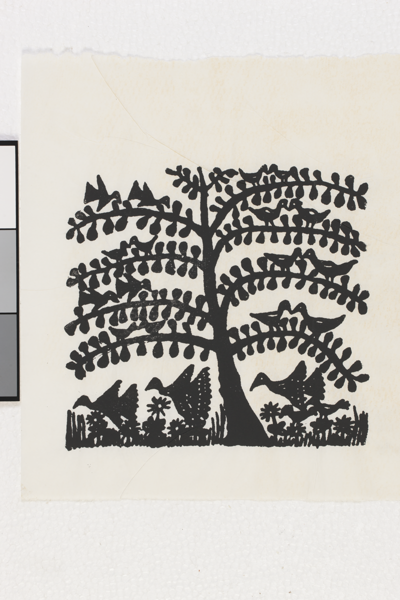 Untitled and undated lino cut by Eamma Damane, featuring a design with birds and tree for fabric printing. See 2014.144 for the textile printed with this design. Condition: fair- creases along edges and into image