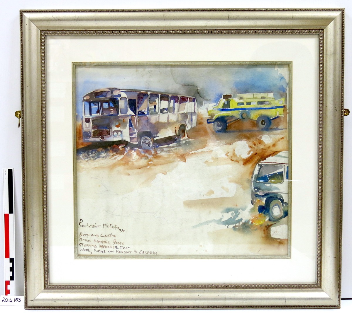 Watercolour (gouache?), by Rochester Mafafo, titled 'Burning and Looting', 1984. Dated and inscribed as 'BURN AND LOOTING/ PETRL BOMBING BUSES/ STOPPING WORKER FROM/ WORK, POLICE ON PERSUIT [SIC] IN CASPERS'. Framed. Condition: good