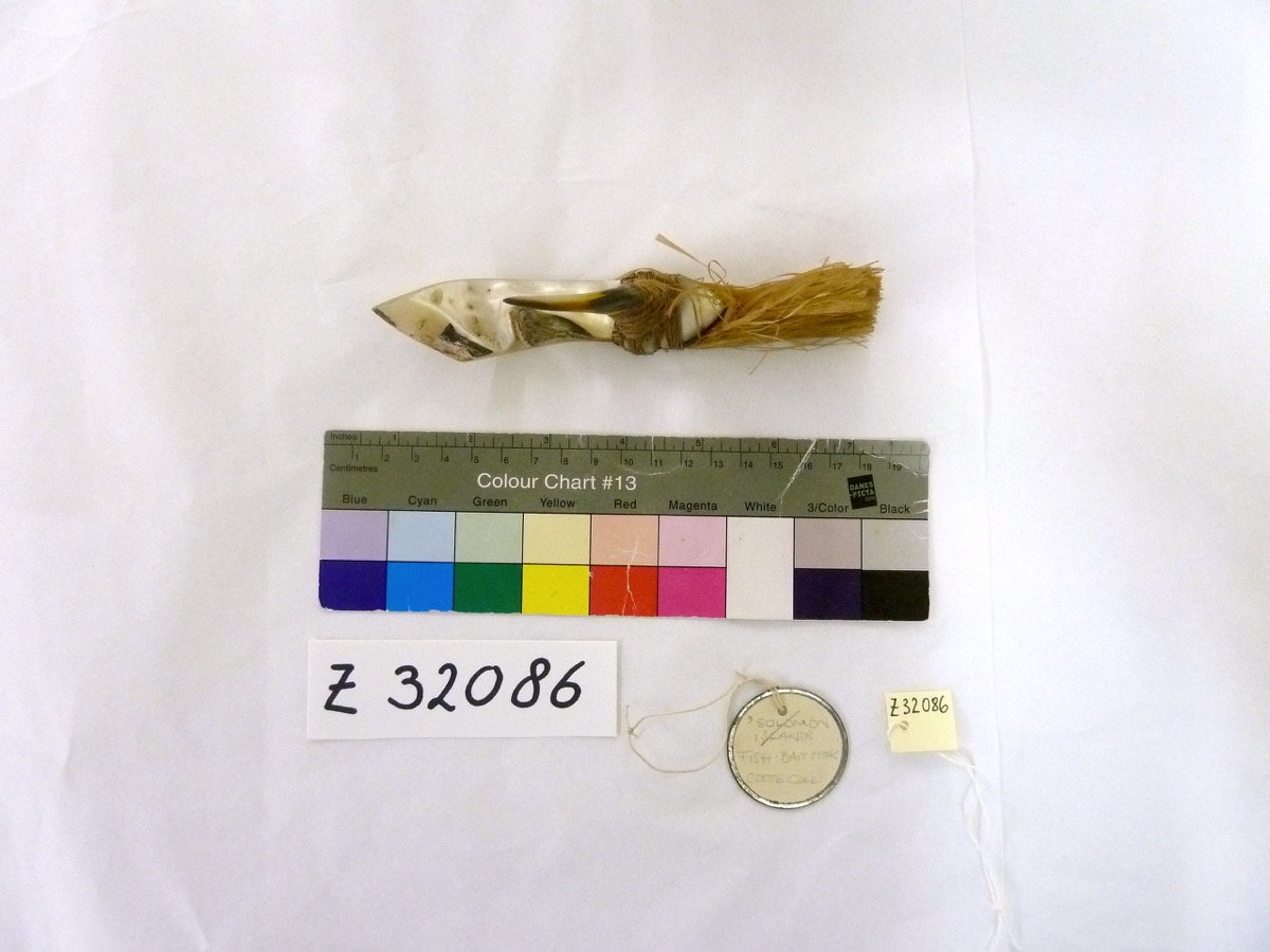 Old round paper label with silver metal edge tied to object reads [in pencil] '? Solomon /Islands [crossed out with pencil]/ Fish Bait hook/ Coote Coll'. On reverse [in black ink] 'Z 32086'. Square white paper label adhered to object reads [in brown ink] 'Fish hook/ Bait / W. Coote/ 18-80'.