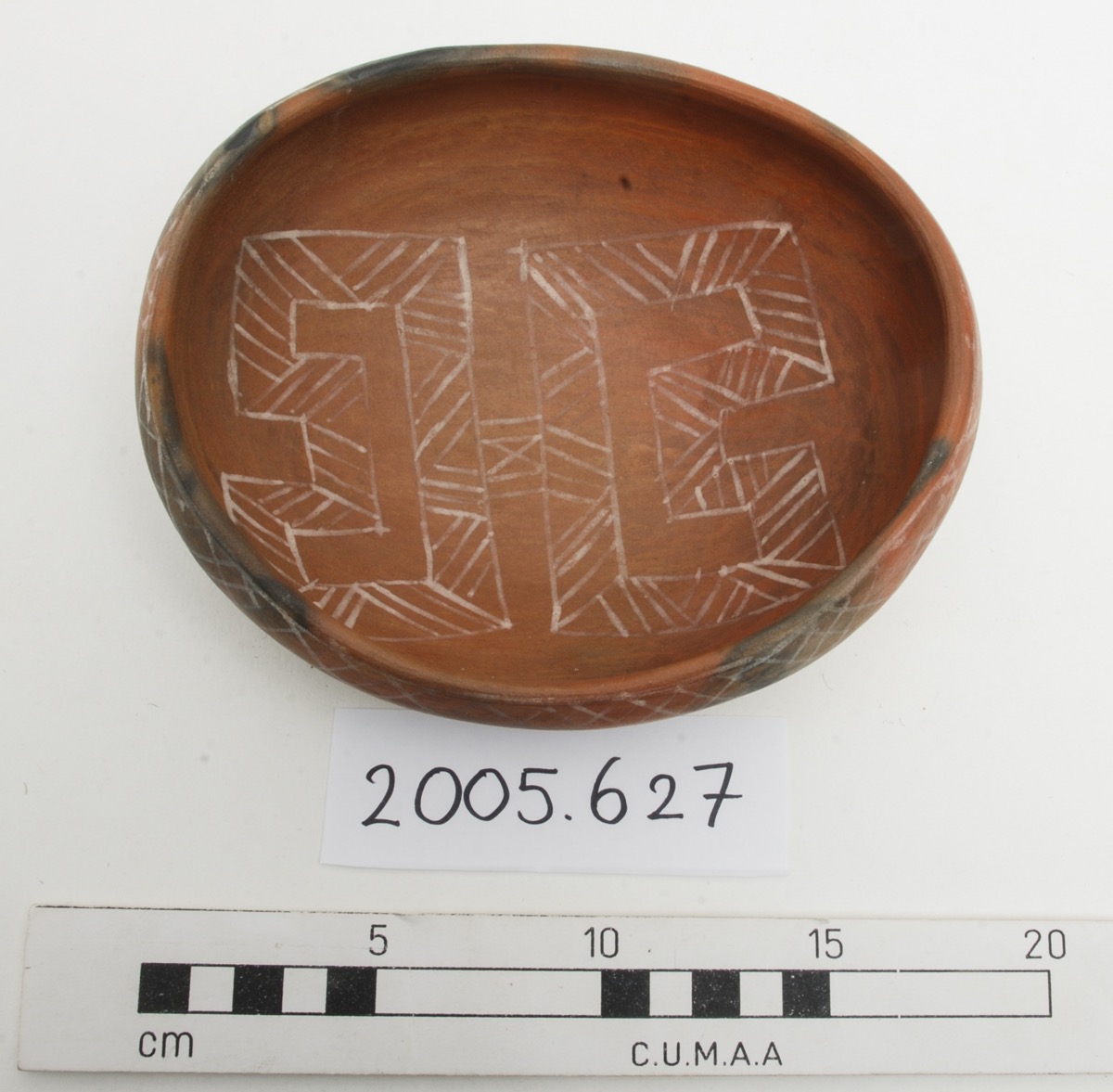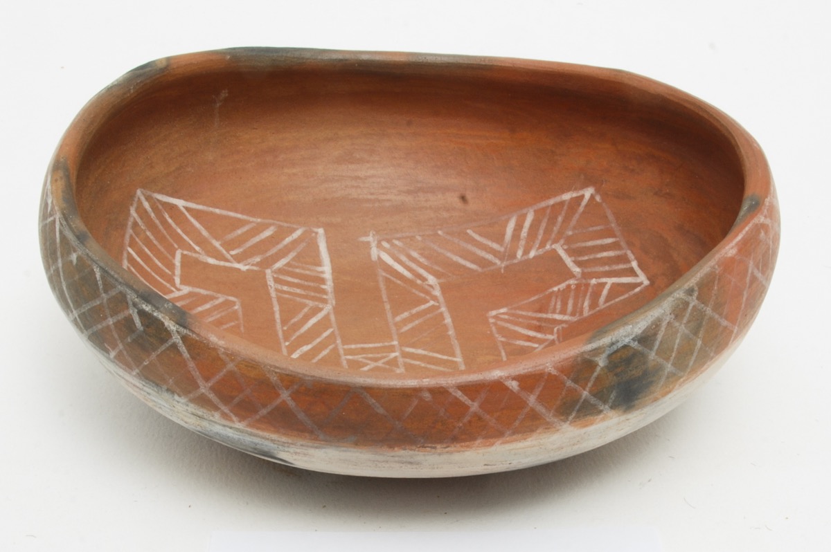 An oval clay pot which was made by a woman for trade. The pot is fired red. The central part of the body is painted white and black. The rim has been decorated with a cross-hatched motif in white and the central part on the inside has geometric decorations in white.