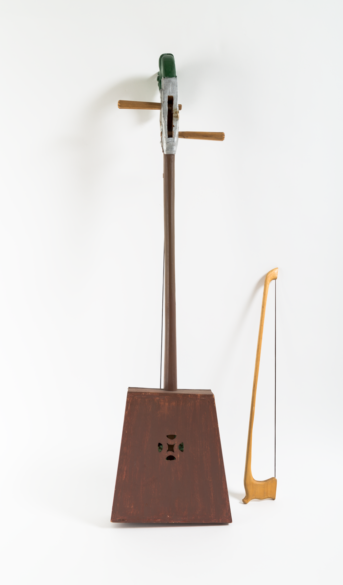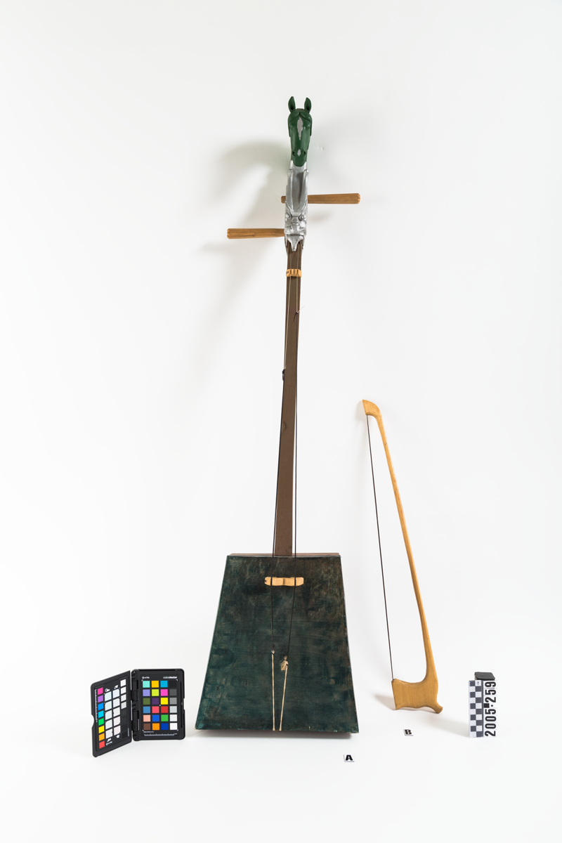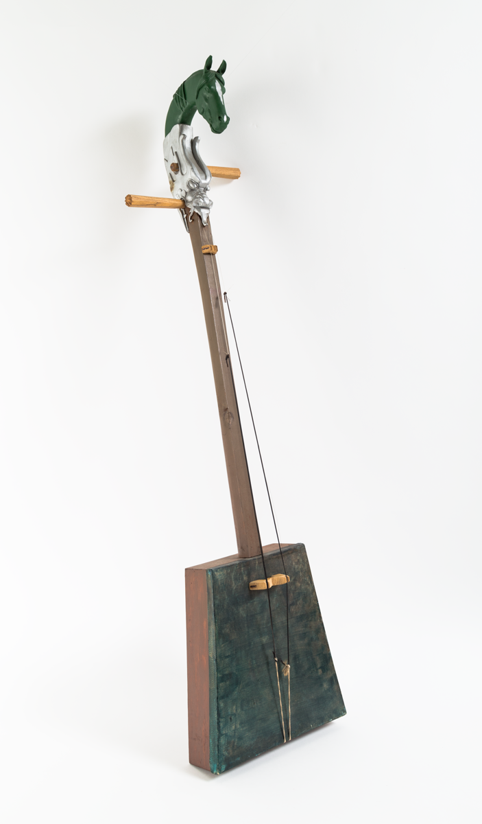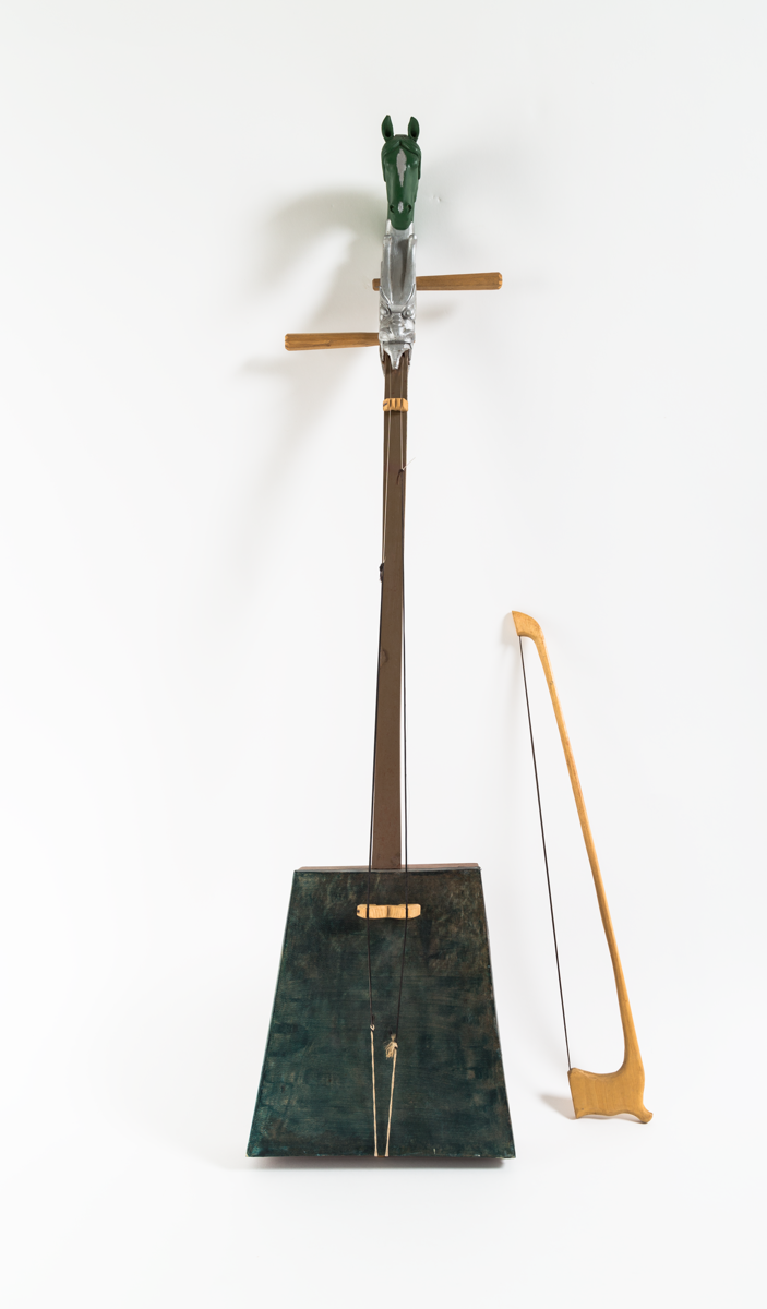 Horsehead fiddle with a four-sided wooden sound box, covered in skin, dyed green, with wooden neck terminating in a dragon?, painted silver, whose open mouth bites the neck, and above whom is a horsehead, painted green, which curves over the dragon. With 2 wooden keys at top of neck, attached to the two strings of horsehair, stretched over a larger M-shaped wooden bridge at the bottom and a smaller M-shaped bridge at the top of the neck but which are tied to the object by lengths of twine at the bottom and ?wire, connecting to the pegs at the top. One horsehair string damaged, and corners of sound box slightly scraped.