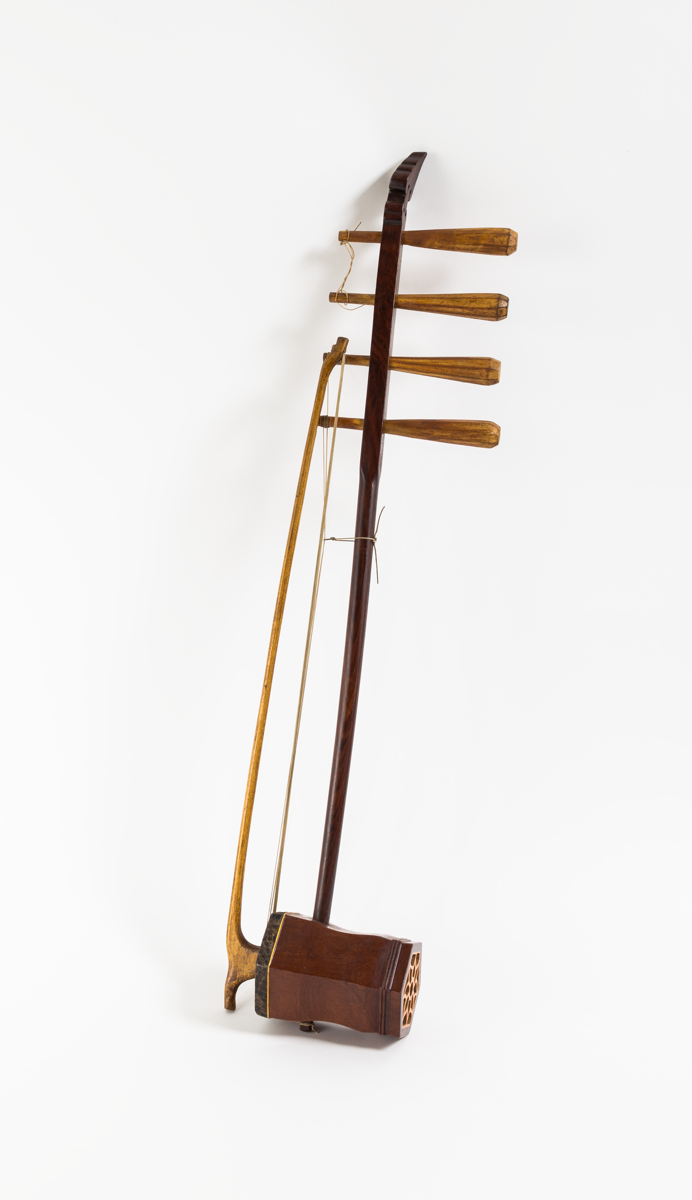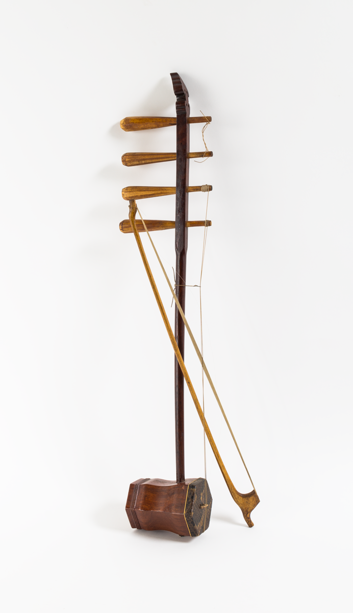 Fiddle (A) with hexagonal shaped polished wooden soundbox, covered with reptile skin and carved with an openwork flower at base. Wooden bow (B) with horsehair string, attached to fiddle.