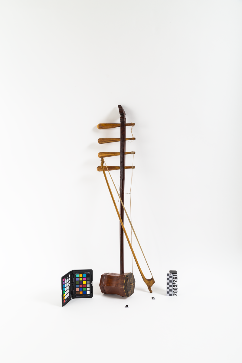 A group of black and white photographs were given together with the three instruments (2005.259 A-F; 2005.260; 2005.261). There are 16 photographs of the instruments themselves, 3 photographs of Mongolian musical instruments and 4 photographs of people holding Mongolian instruments. One these is a colour image. The photographs await archiving for the photo archive.