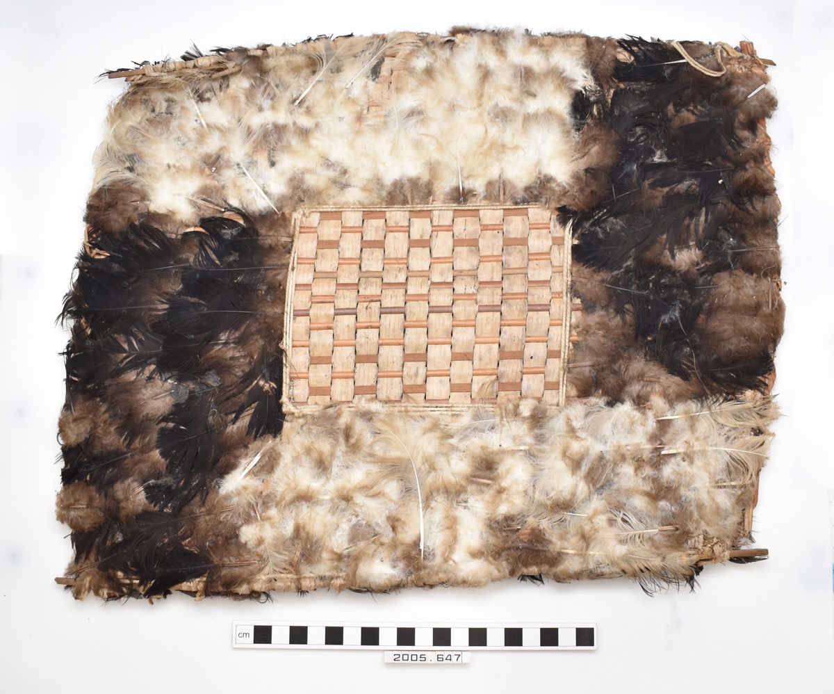 Kunana or stinging mat of woven palm fibre. A rectangular shaped piece of woven palm fibre with brown and white feathers adhered to the outer edge. Both sides of the mat are like this.