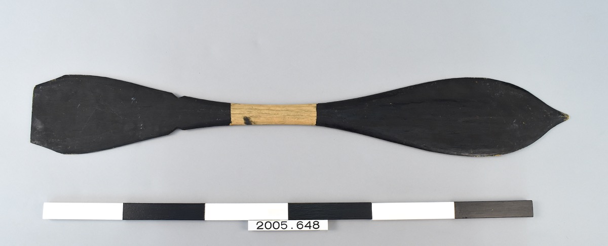 Small paddle. The blades are both rounded; one tapers to a point, and the other is truncated with a flat edge and a triangular notch in both sides. The paddle is painted with black synthetic paint, except for the narrow central part where the wood retains its natural colour.