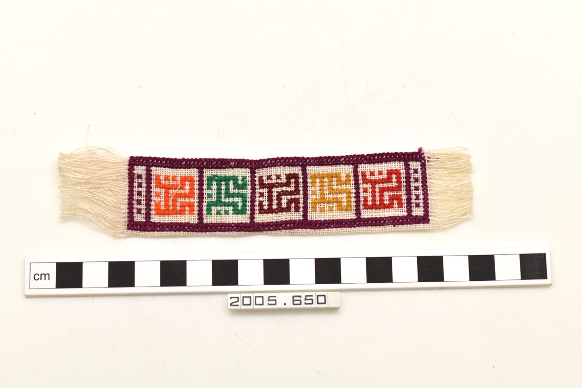Cotton bookmark with tassels at either end. Decorated on one face using cross-stitch forming five panels, each containing the profile of an abstracted four-legged animal with a long tail, possibly a squirrel monkey or a dog. The embroidery thread is purple, orange, green, red and yellow.
