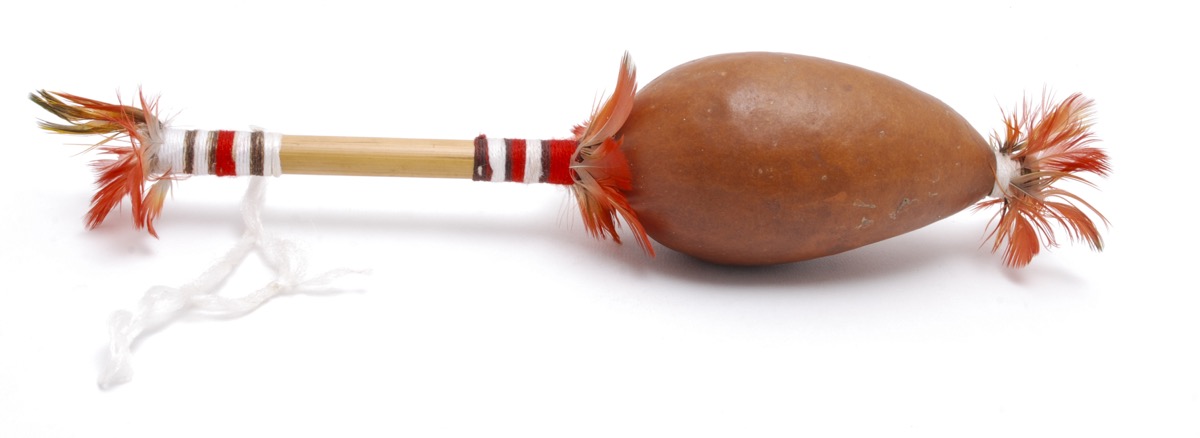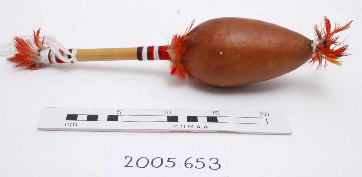 Rattle or maraka, made of maraka (Lagenaria siceraria) gourd, wood, bound with cotton, and decorated with feathers of kïnolo, scarlet macaw, aramacao.
