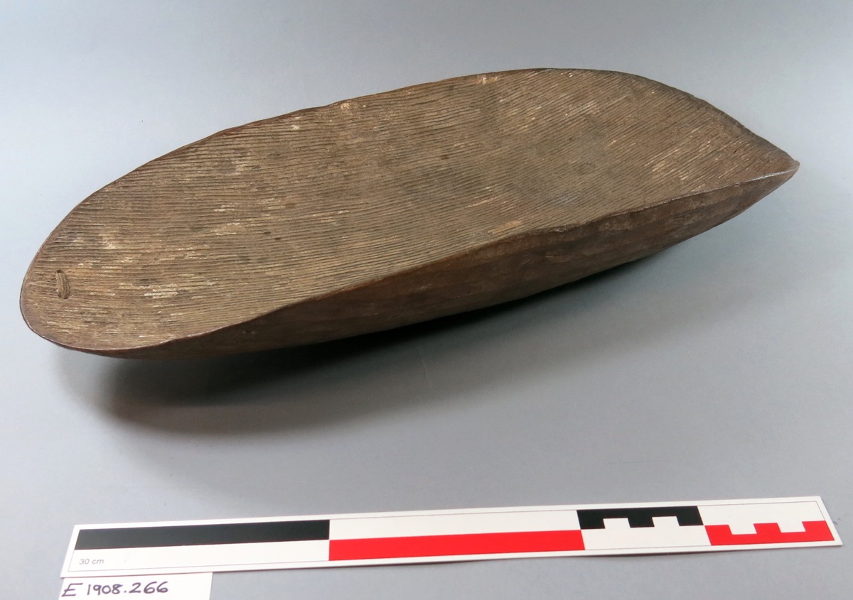Wooden bowl with rounded bottom and ends. The inside is finely grooved, the outside is textured, and a crack has been repaired using plant fibre.