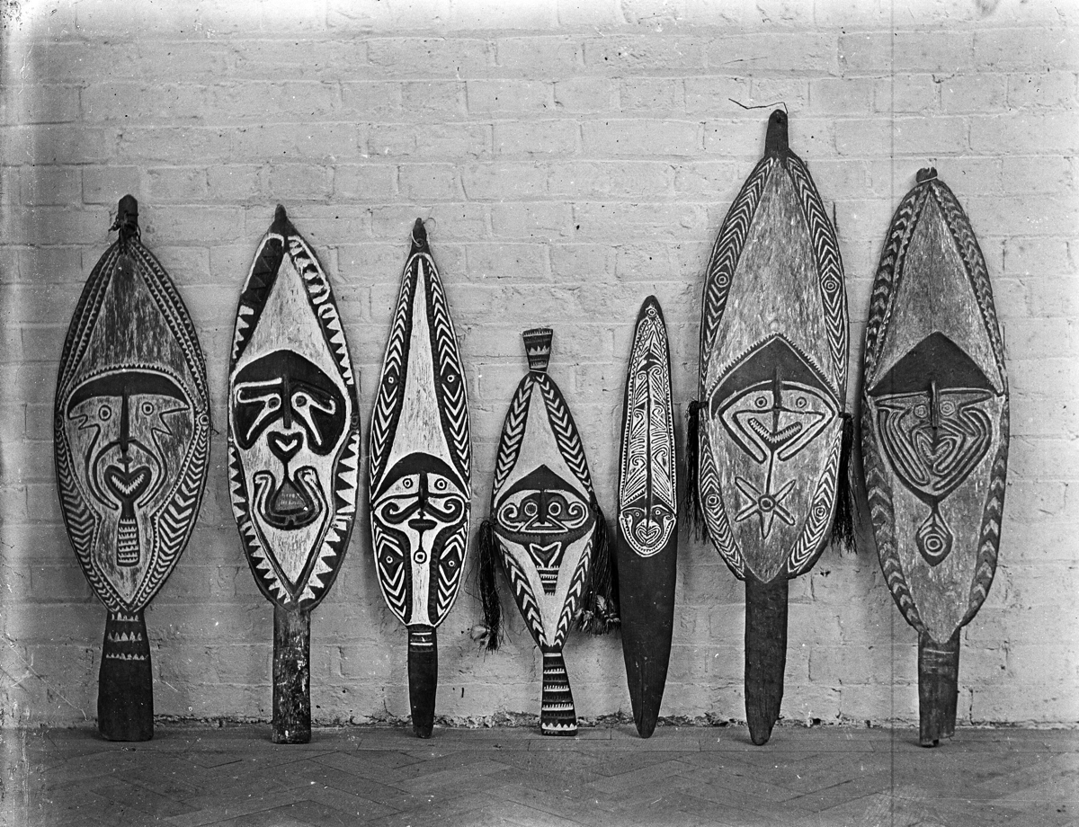 A gope, (spirit or ancestor board), kept in the men's house. Also called kwoi or hohao, depending where it was made. Powerful spirits (imunu) were associated with a specific location in the landscape, rivers, or sea, and were linked to the specific clan within whose territory they dwelt. Individual imunu inhabited gope boards and their image appears on the front.