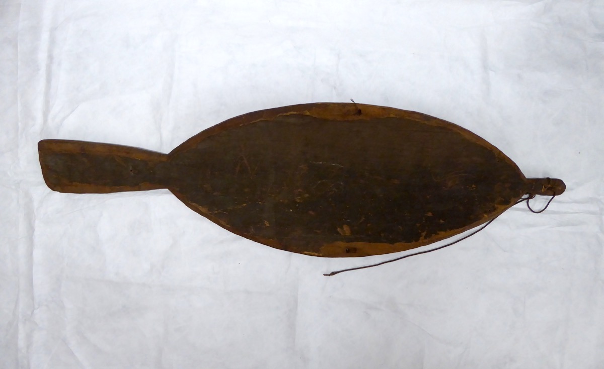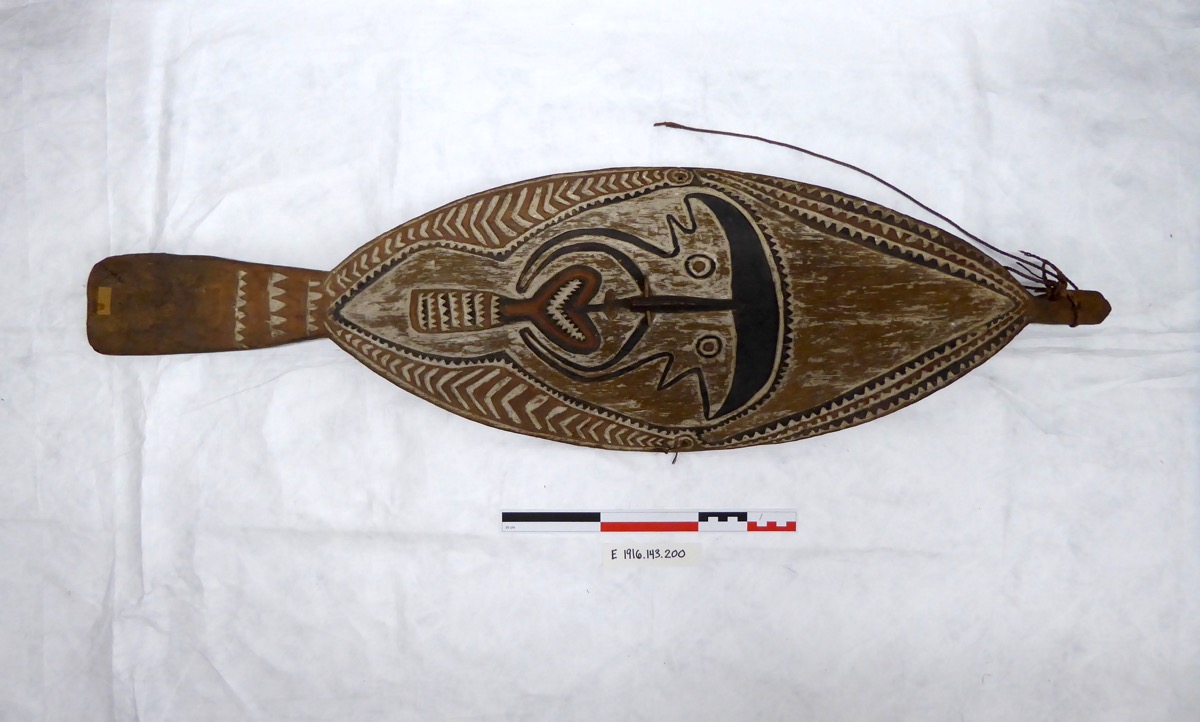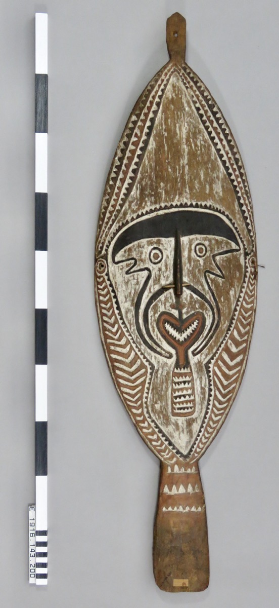 Ceremonial tablet 'Koe'. Painted oval, with pierced tang at top, & tang at base decorated with 3 rows of toothed lines. Hole at each side. Slightly concave-convex. Toothed line border on upper half, chevron border lower half. Human face design surmounted by toothed line, with beard-like tab below mouth. Projecting nose with nose-stick through perforation. Description taken from catalogue card.