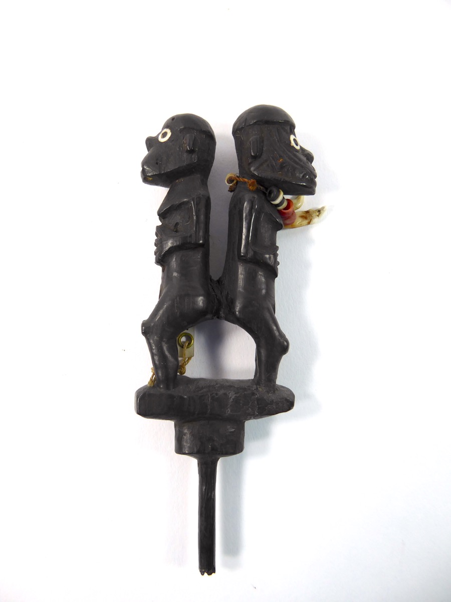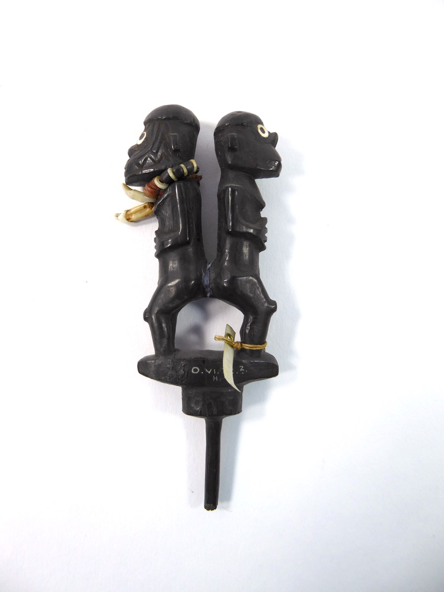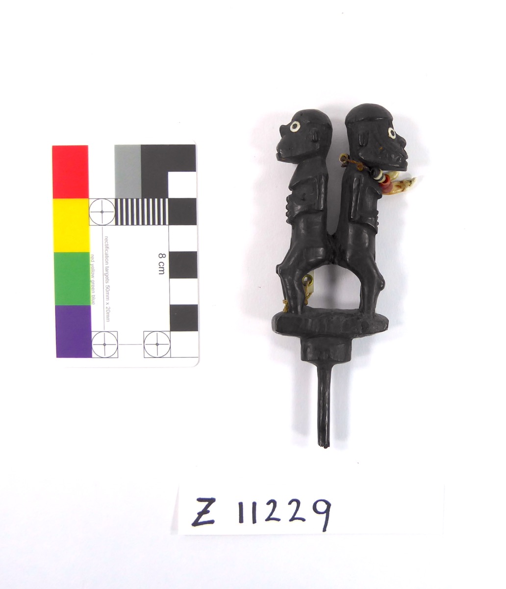 Object consisting of two small figures of men, standing back to back, carved from hard wood. The eyes are of mother of pearl shell and one of the figures has a necklace of tiny clam shell beads, red white and black. Description taken from catalogue card.