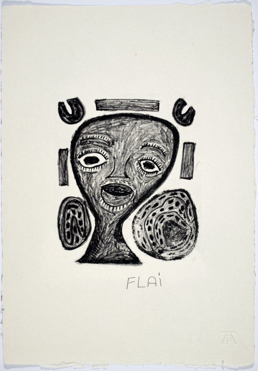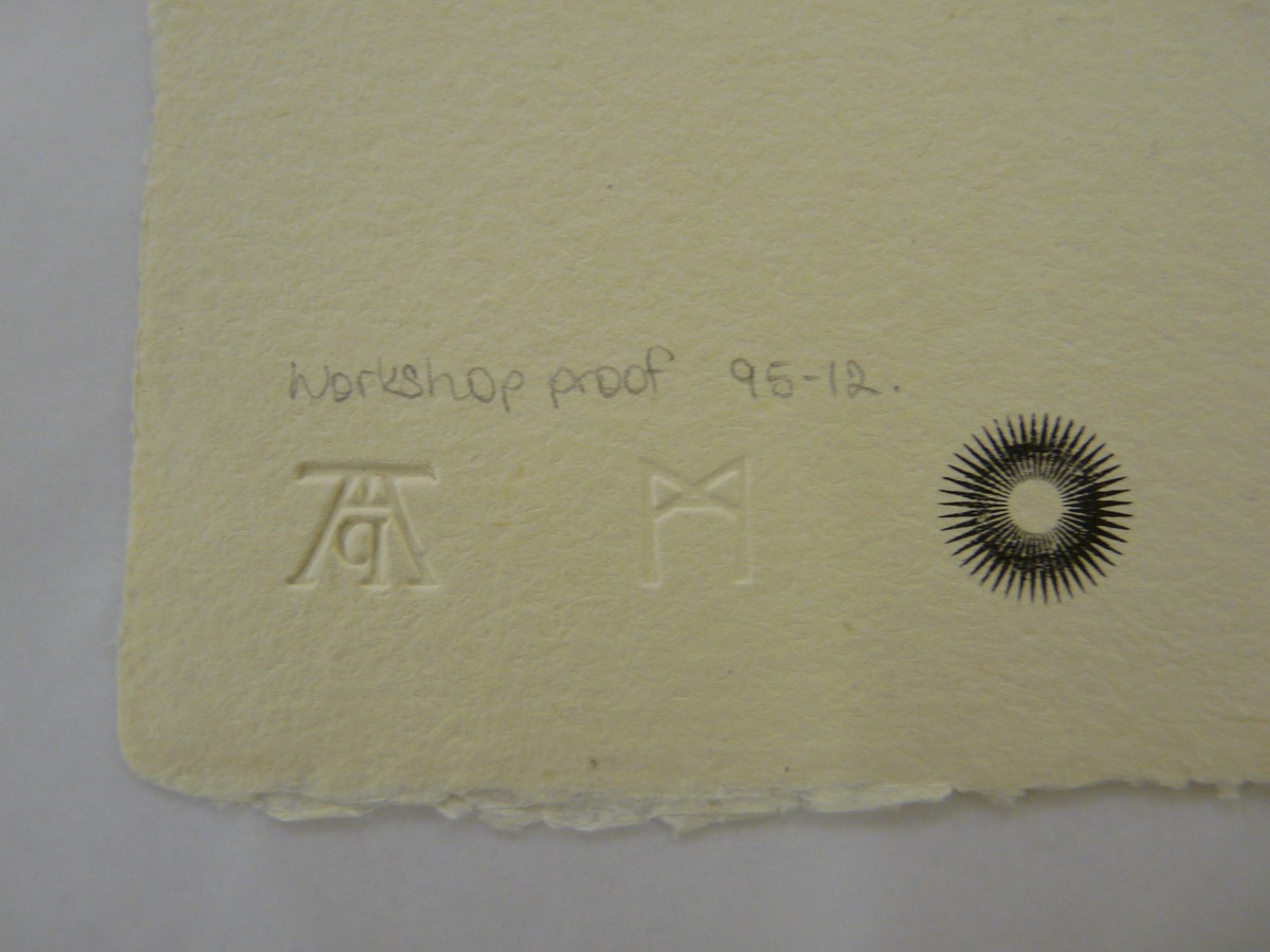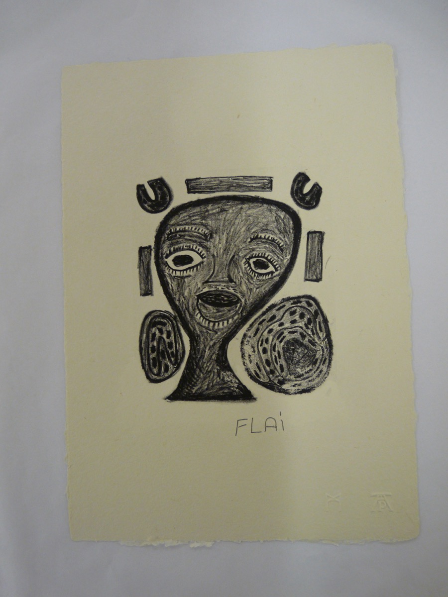 Single colour handprinted lithograph by Fulai (Flai) Shipipa titled 'Identity Document', or in Afrikaans, 'Kopkaart', 1995. Edition: 12/30. Signed by the artist with 'Flai'. Inscribed on reverse with 'Workshop proof 95-12' and a sun stamp. A blindstamp of The Artists Press logo and one with an M-shaped design are visible in the bottom right hand corner. Condition: Very Good.