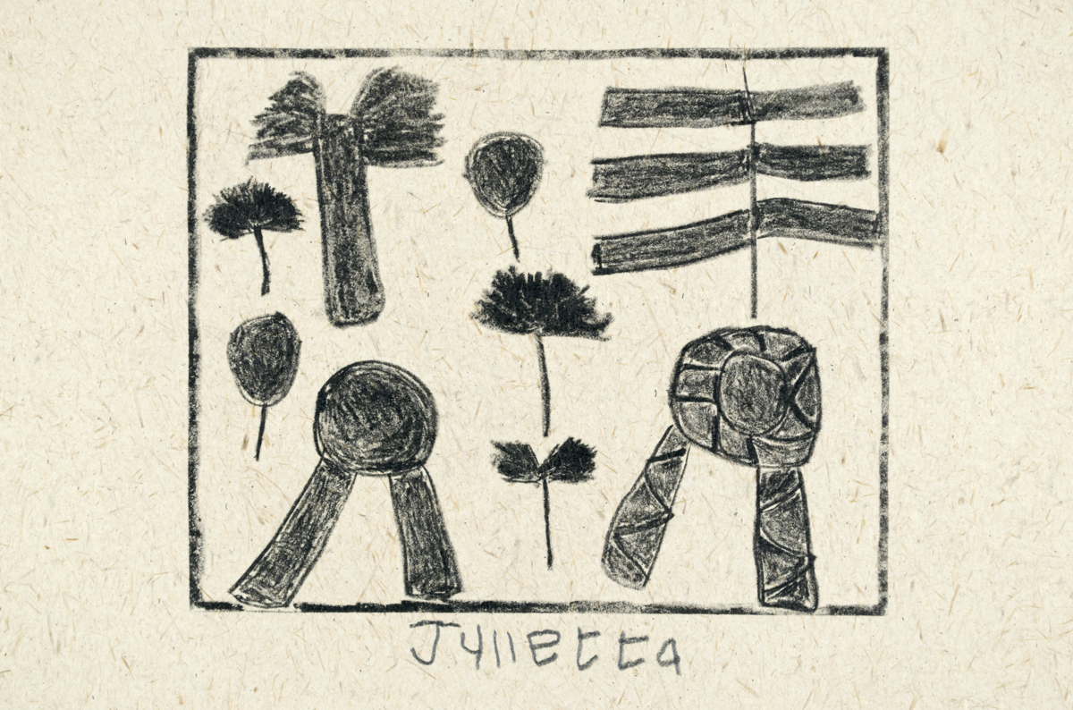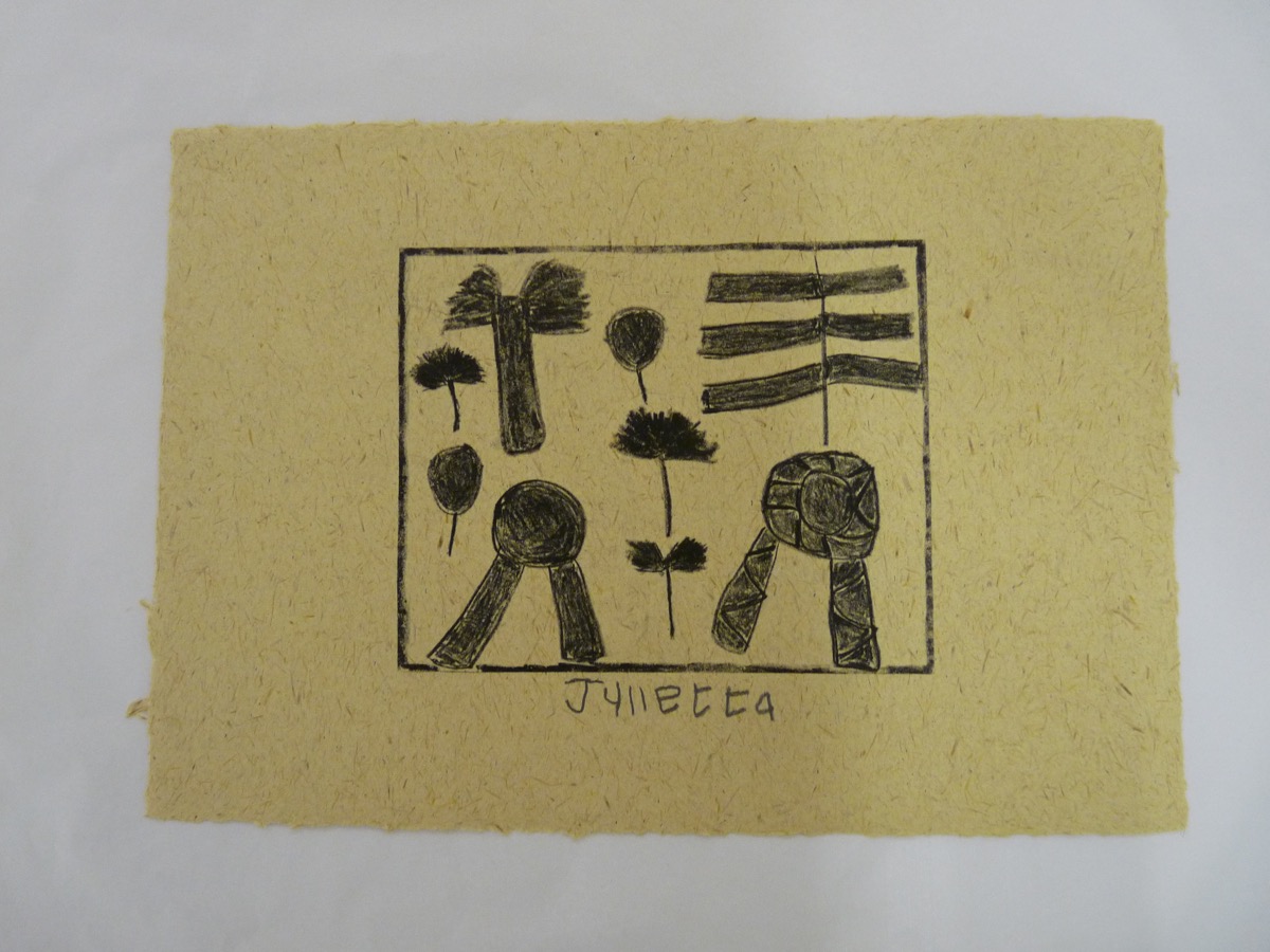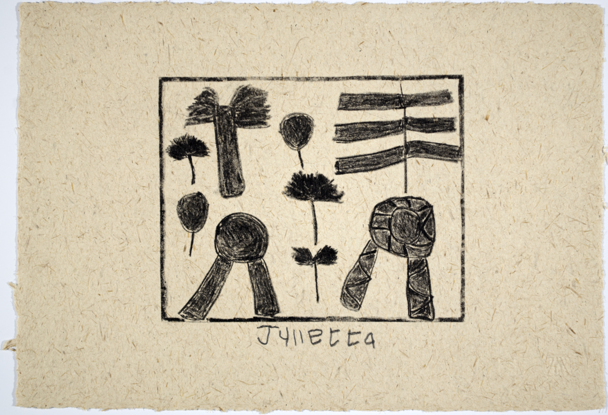 Print; Lithograph - Single colour handprinted lithograph by Julietta (Jurietta) Carimbwe titled 'Leaves', or in Afrikaans, 'Blare', 1995. Edition: 11/28. Signed by the artist with 'Julietta'. Inscribed on reverse with 'Workshop proof 95-11' and a sun stamp. A blindstamp of The Artists Press logo and one with an M-shaped design are visible in the bottom right hand corner. Condition: Very Good.