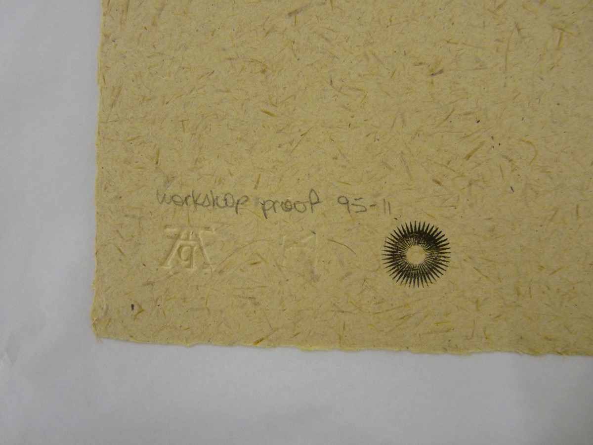 In 1994 Tamar Mason initiated a tinwork project with women at Schmidtsdrift. The craft project produced decorative household items from recycled and waste tin sheeting. Having coordinated the first lithographs produced with the Kuru Art Project she then assisted Mark Attwood to get funding from The Foundation For Creative Arts for a lithography workshop and to edition a suite of prints. These are the prints that resulted from the project. They were not published by The Artists’ Press but were the property of the artists and were sold under the auspices of the art project.