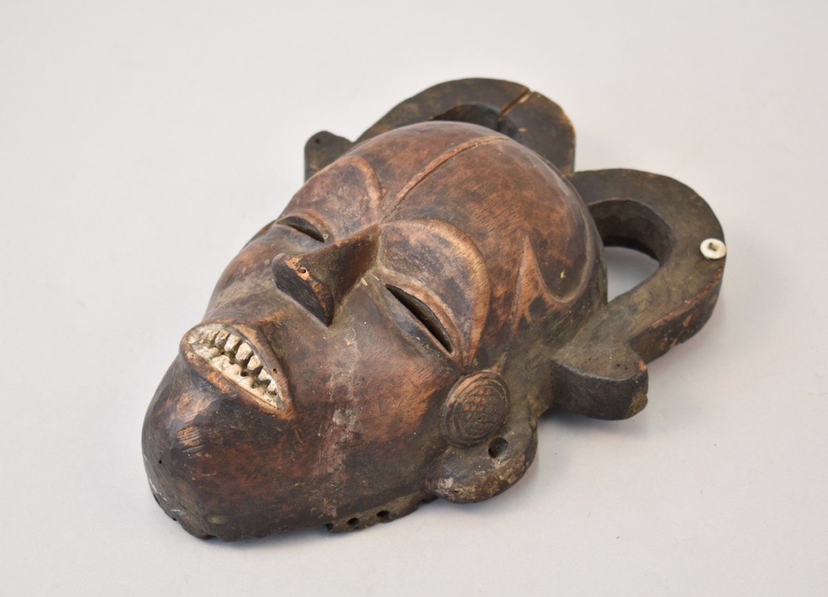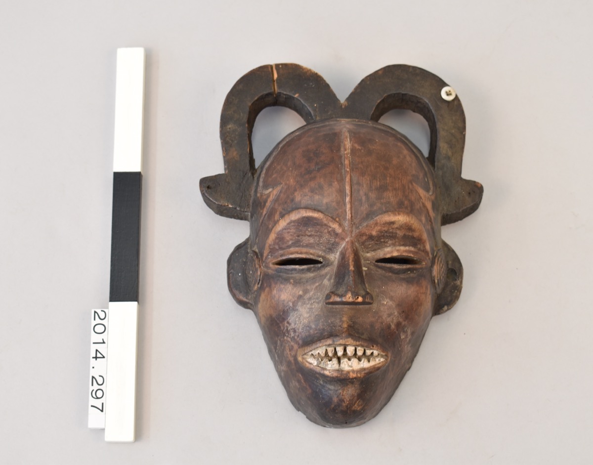 Female spirit mask. Wood, brown face with black side projections in the shape of horns. White pointed teeth. A white button is attached to the right projection.Holes running along the edge of the mask possibly for raffia attachments. severe insect damage visible on reverse of mask in the chin area. The left projection is cracked. abrasions on nose. Several signs of insect damage throughout. Condition: Fair, several cracks on forehead and back of mask.
