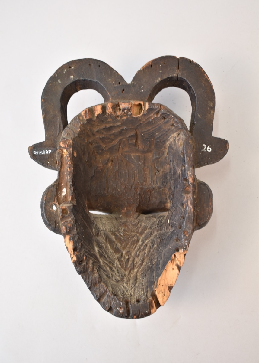 Exhibited in the Micro Gallery MAA from 13 March 2013 - 19 May 2014 as a means to raise awareness and funding for the acquisition of the G.I. Jones Collection. The exhibition label for 2014.297 and 2014.293 reads: ' ‘Beautiful’ and ‘comic’ Lughulu masks Wood, camwood stain, kholin pigment and a glass button. Isu-Item Igbo. Probably Ugwueke Alayi town and Item town, Cross River area, Nigeria. Probably 1930s. The Lughulu masquerade was performed by the Item and Alayi groups but little is known about it. The characters wore two types of masks, beautiful, which were female and white-faced, or stained red/brown with camwood like this one: or ugly, which were white faced or stained black. These were considered comic rather than fierce as among the neighbouring Anang Ibibio.'