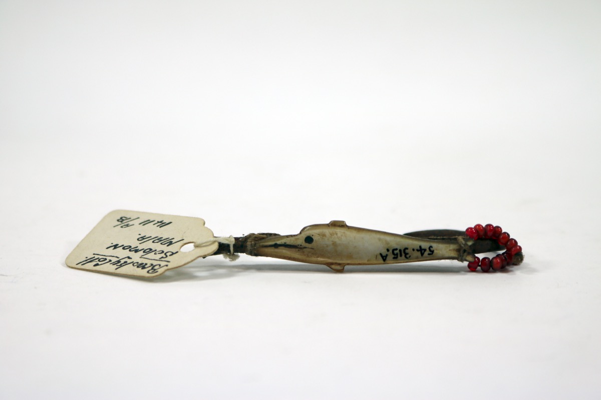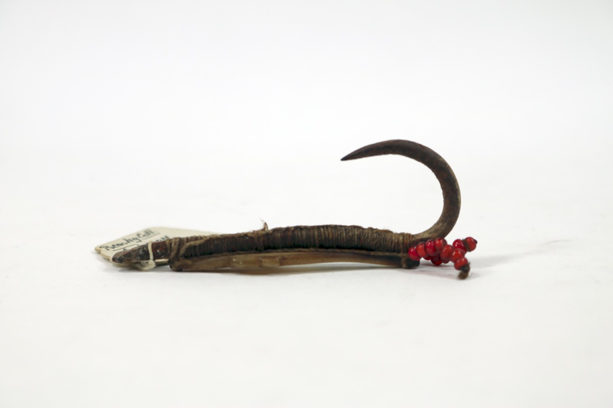 Fish-hook of turtle shell. A piece of mother-of-pearl carved in the shape of a fish/dolphin/shark has been attached to the back and tied on with plant fibre. A hackle formed of two tassels of red glass beads is tied to the lower part of the shank.