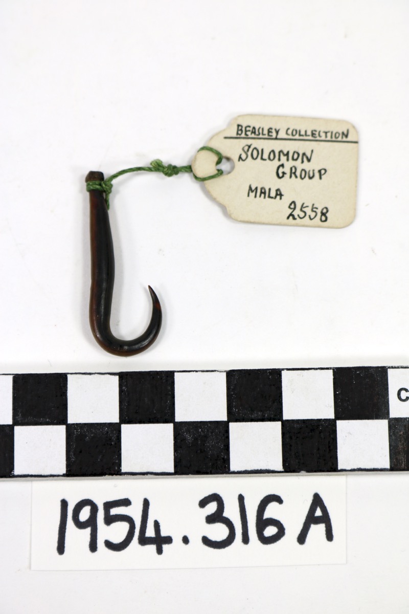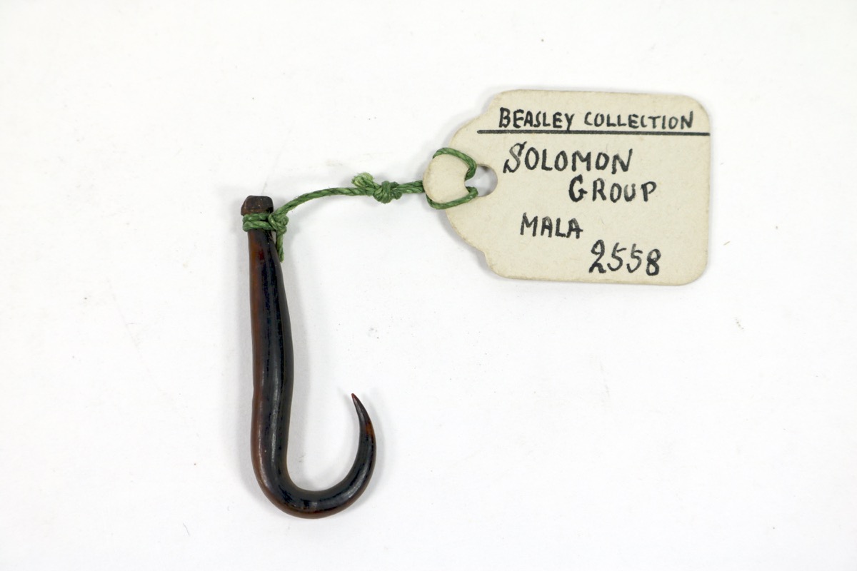 This object was previously in the collection of Harry Geoffrey Beasley no.2499. The entry in Beasley's original catalgue (vol.3) reads: 'SOLOMON GROUP: - MALA: - Fish hook in one piece made of turtle shell. Admiral Davis Collection. H.M.S. Royalist in the Pacific 1890-1893. Bought: - Edward Gerrard, 61 College Place, Camden Town, N.W.1.’ It was purchased by Beasley on 27 February 1930 [Lucie Carreau, 05/09/2017].