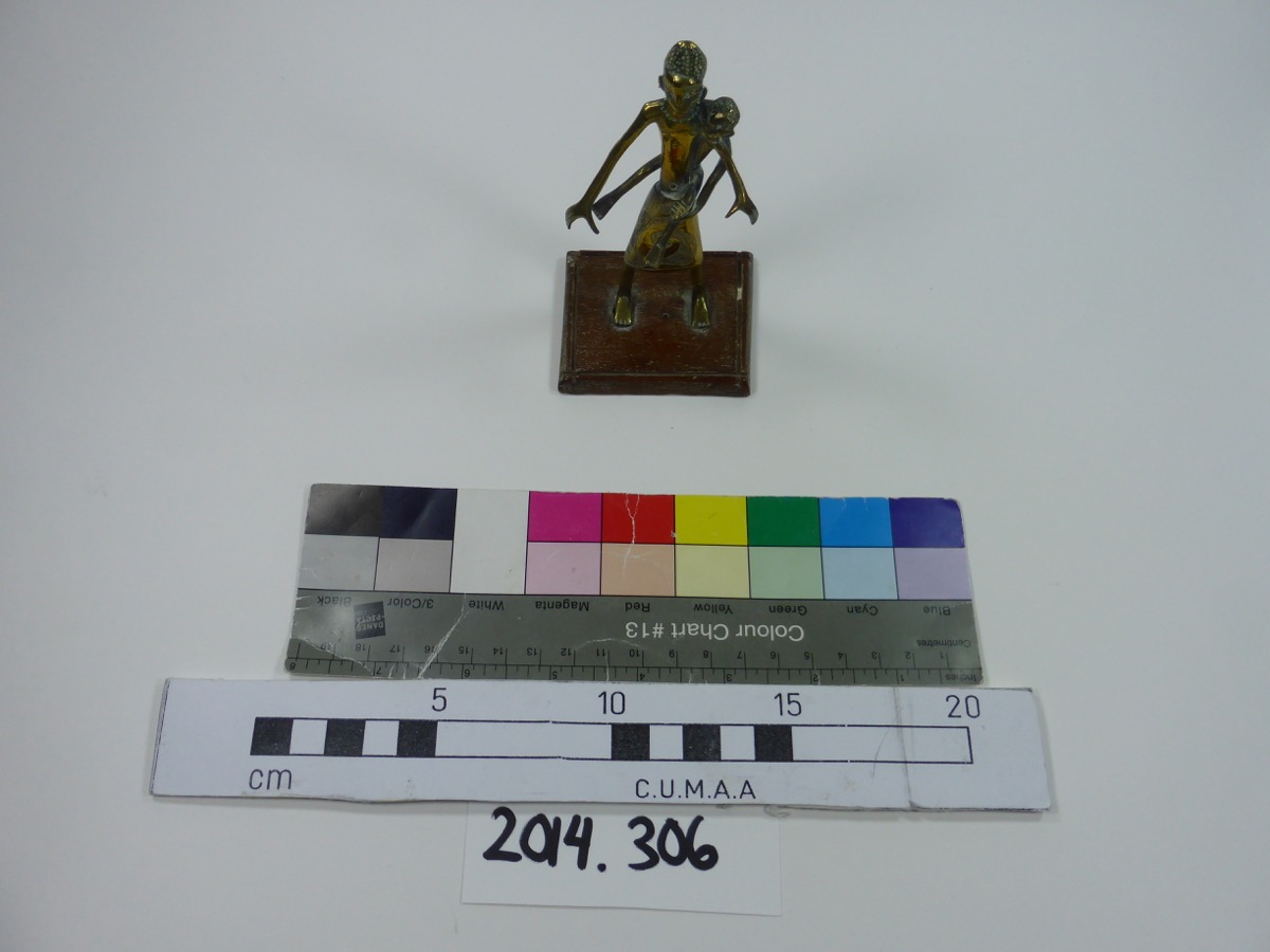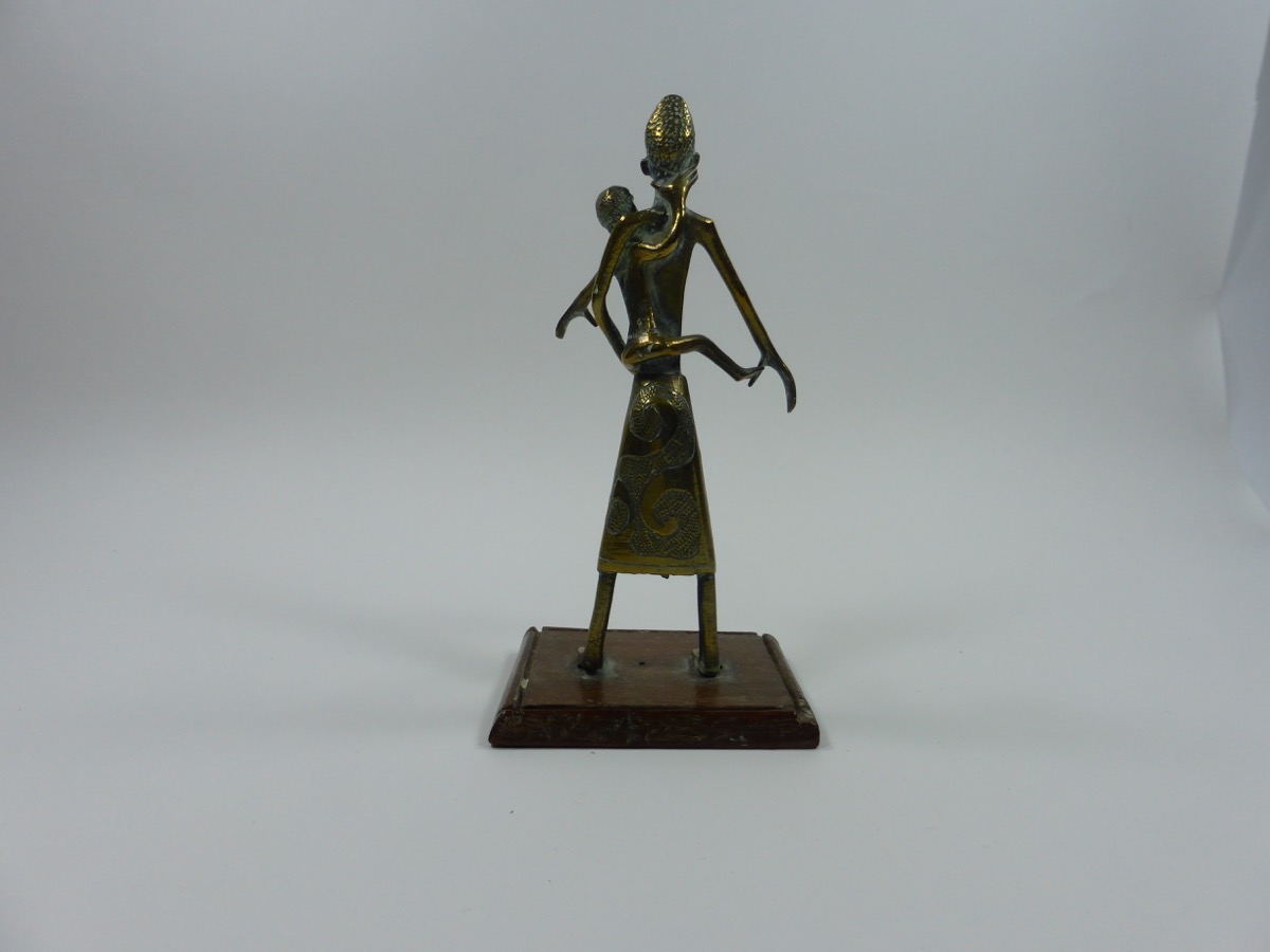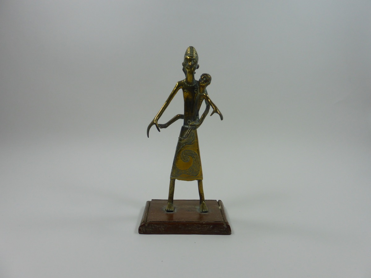 Figure of a woman and child made from brass. She is depicted wearing a long skirt, with a swirled pattern filled with small dots, and a necklace. She is stood with her arms slightly outstretched, and is carrying a child on her left hip. The woman is stood on a wooden rectangular base.