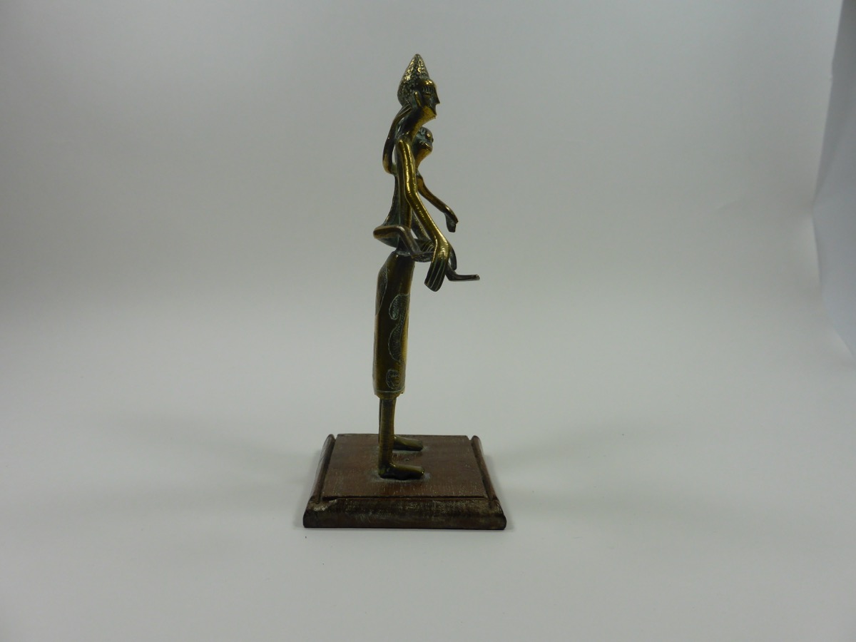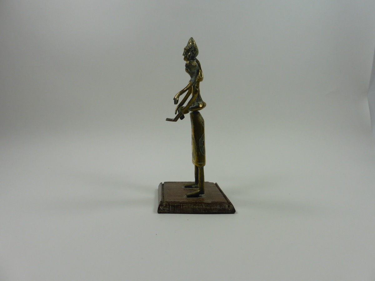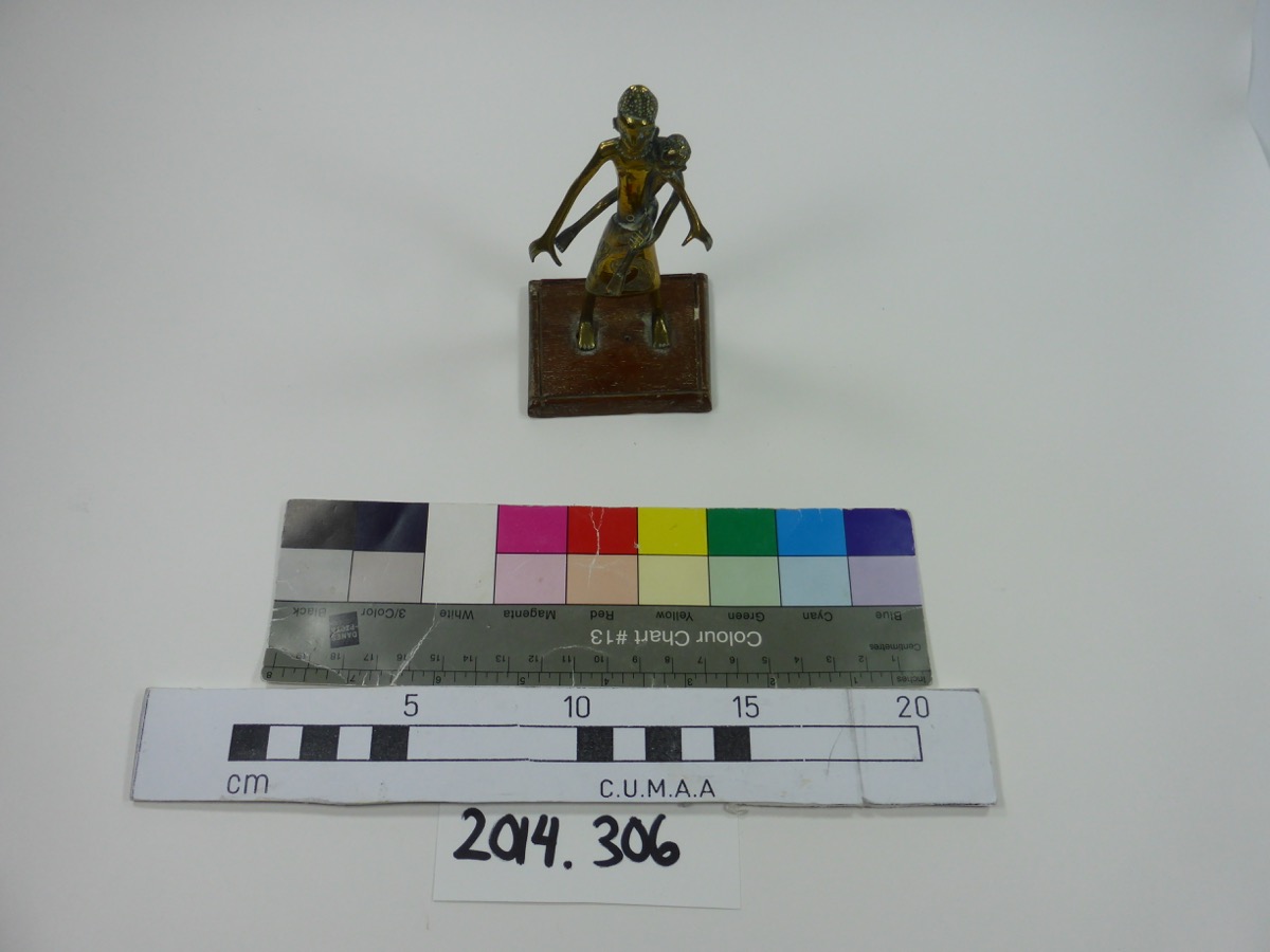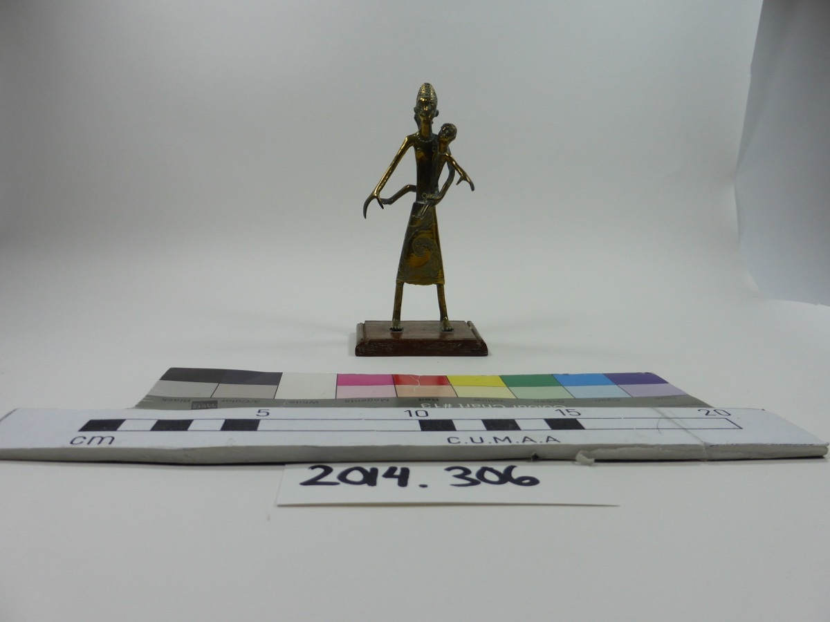Figure of a woman and child made from brass. She is depicted wearing a long skirt, with a swirled pattern filled with small dots, and a necklace. She is stood with her arms slightly outstretched, and is carrying a child on her left hip. The woman is stood on a wooden rectangular base.