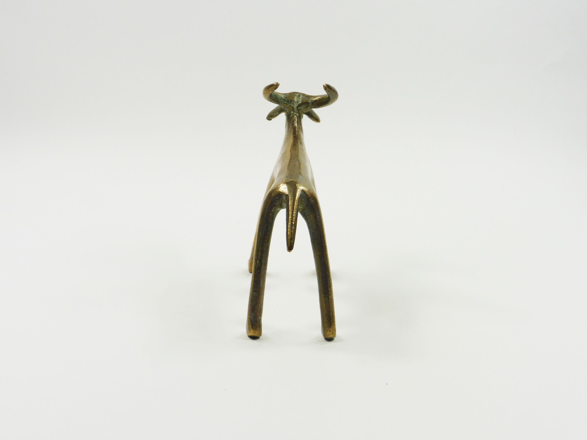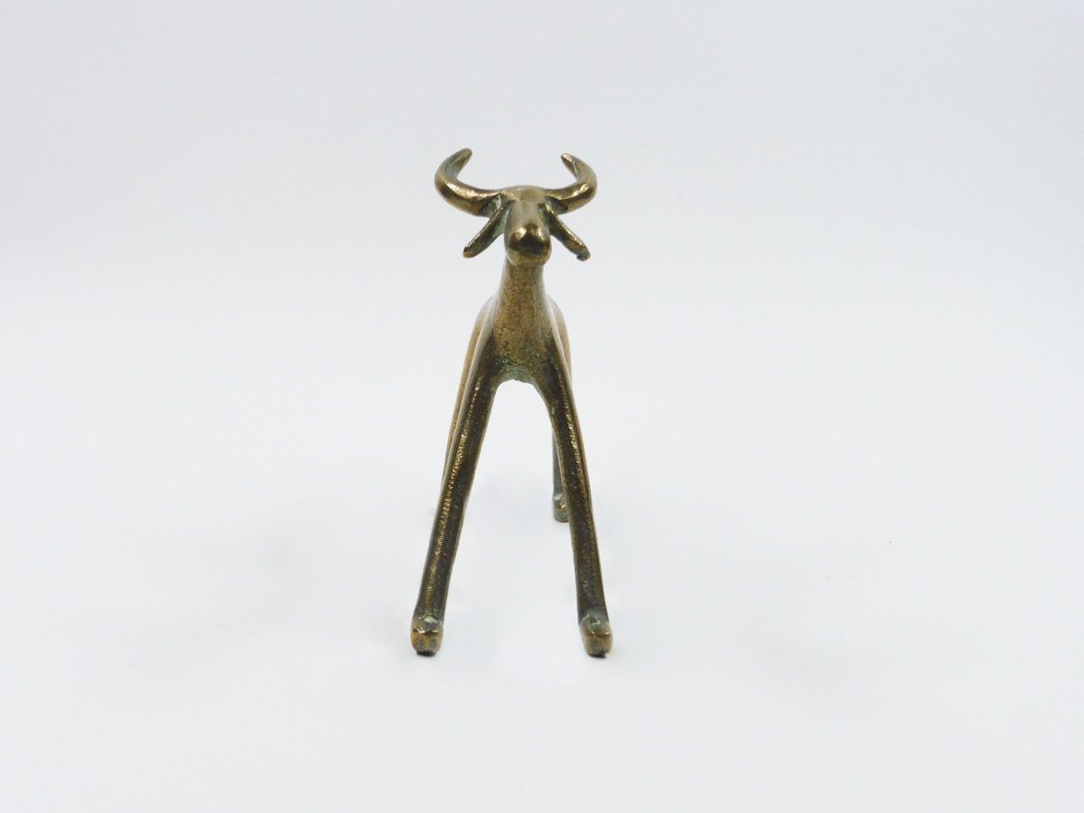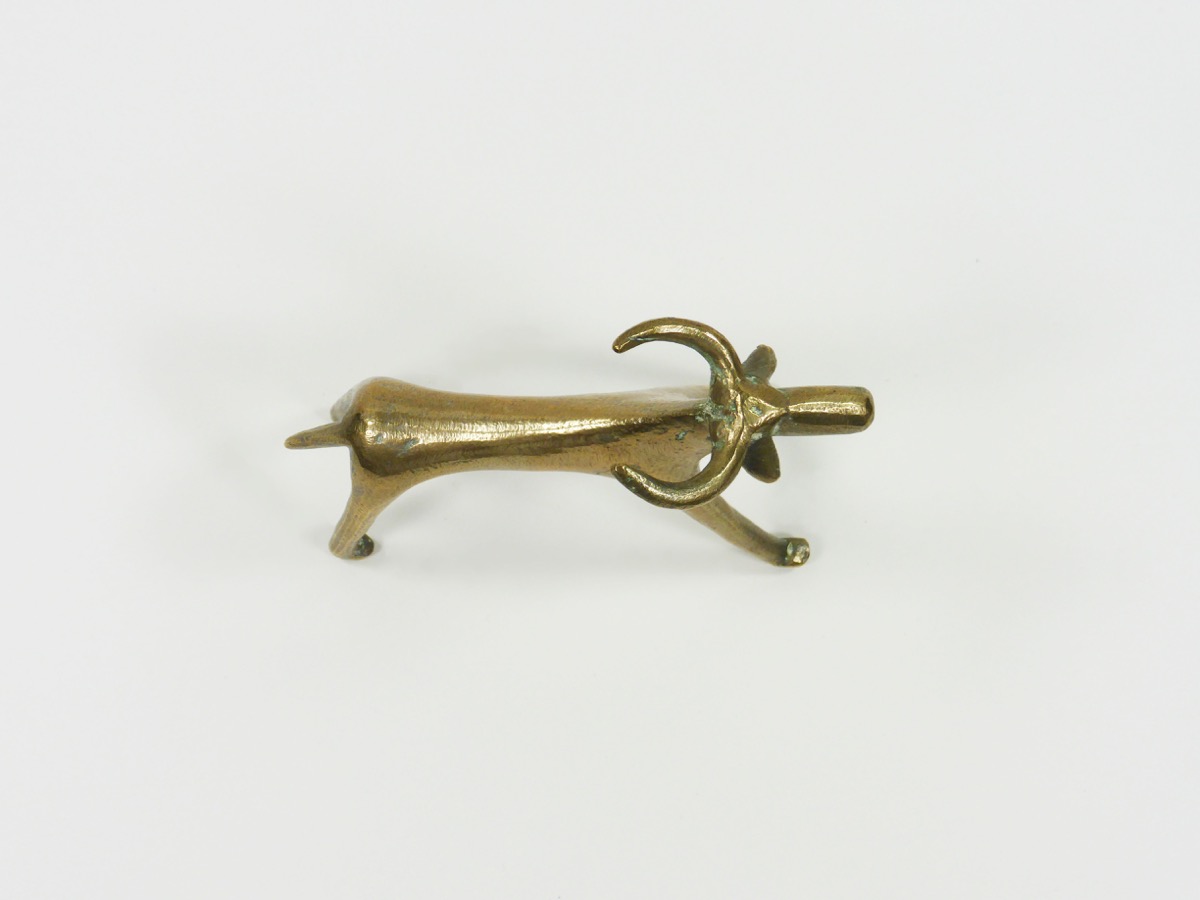 Elongated cow figure, brass. Two large horns and small drooping ears. Condition: Good.