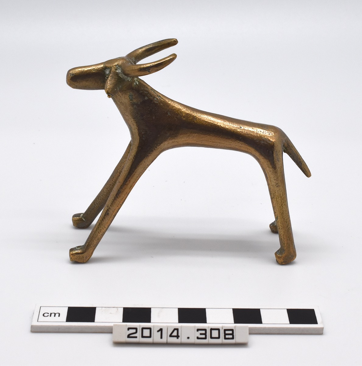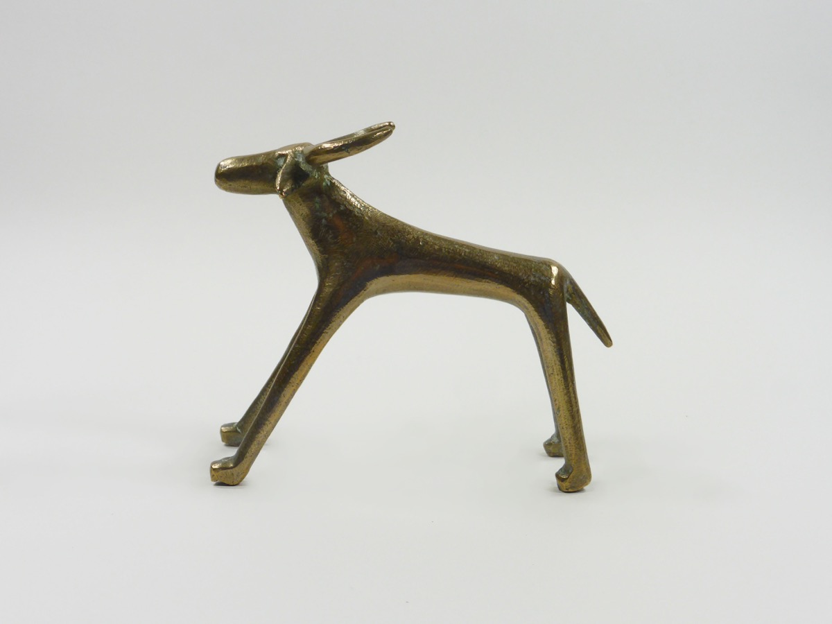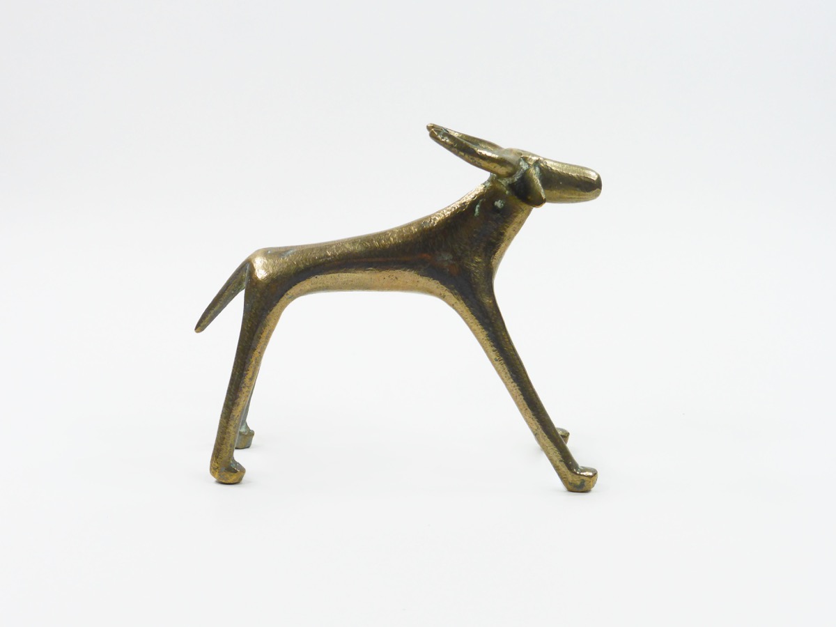 Elongated cow figure, brass. Two large horns and small drooping ears. Condition: Good.