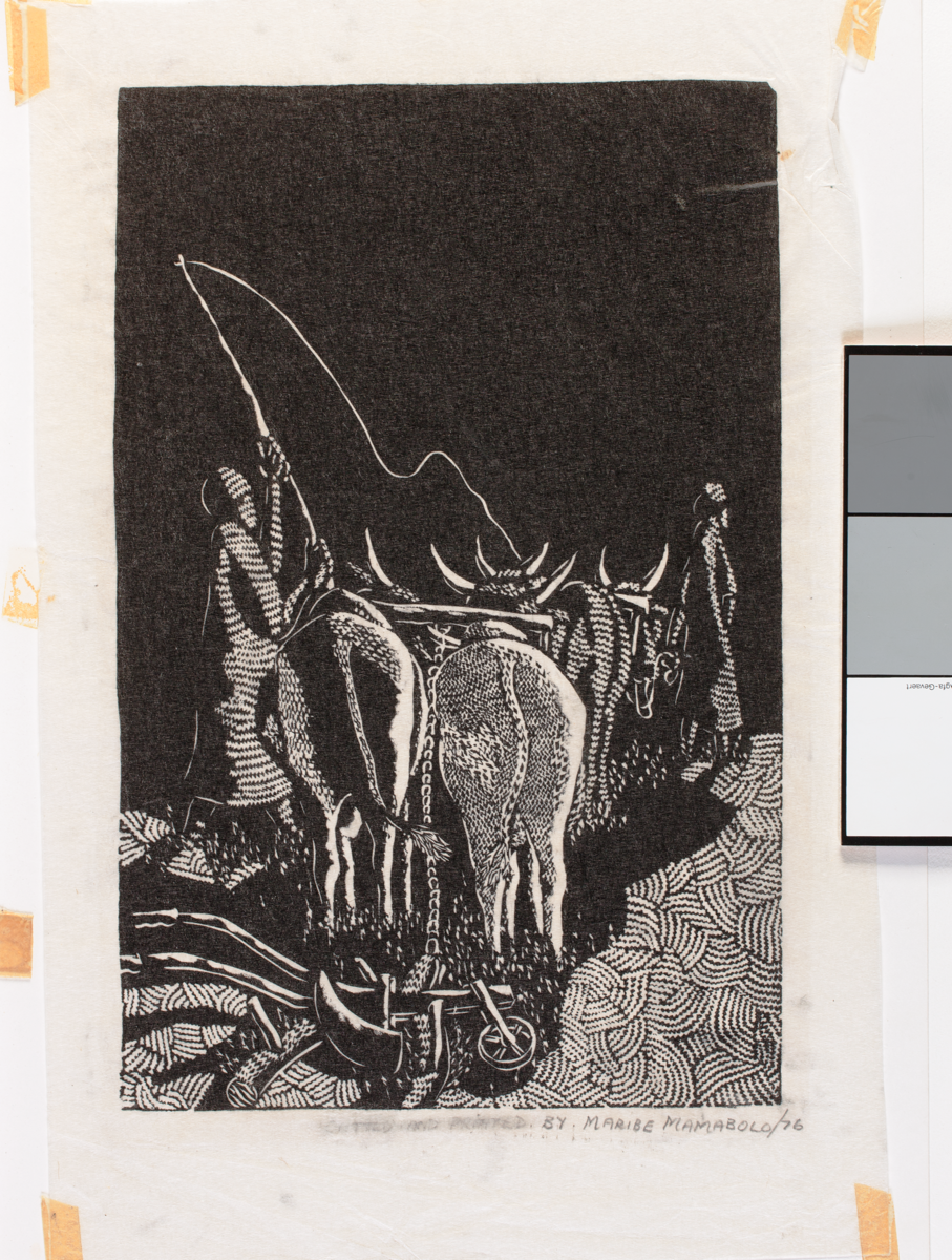 Linocut by Maribe Mamabolo untitled (oxen), 1976. Title crossed out on print. Edition number not provided. Signed and dated: 'By Maribe Mamabolo/ 76'. Condition: Fair. Tags remain on print.