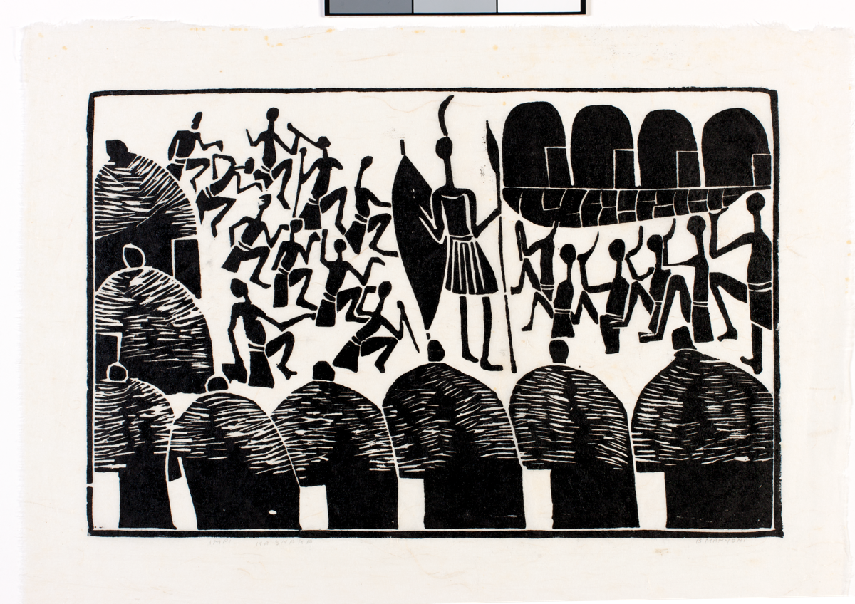 Linocut by Bhekisani Manyone titled 'Impi ka Shaka', undated. Edition: unnumbered. Signed and inscribed: 'Impi Ka Shaka B Manyoni'. Foxing and water stains to edges and creases and a mark in the printed area. Condition: Fair.