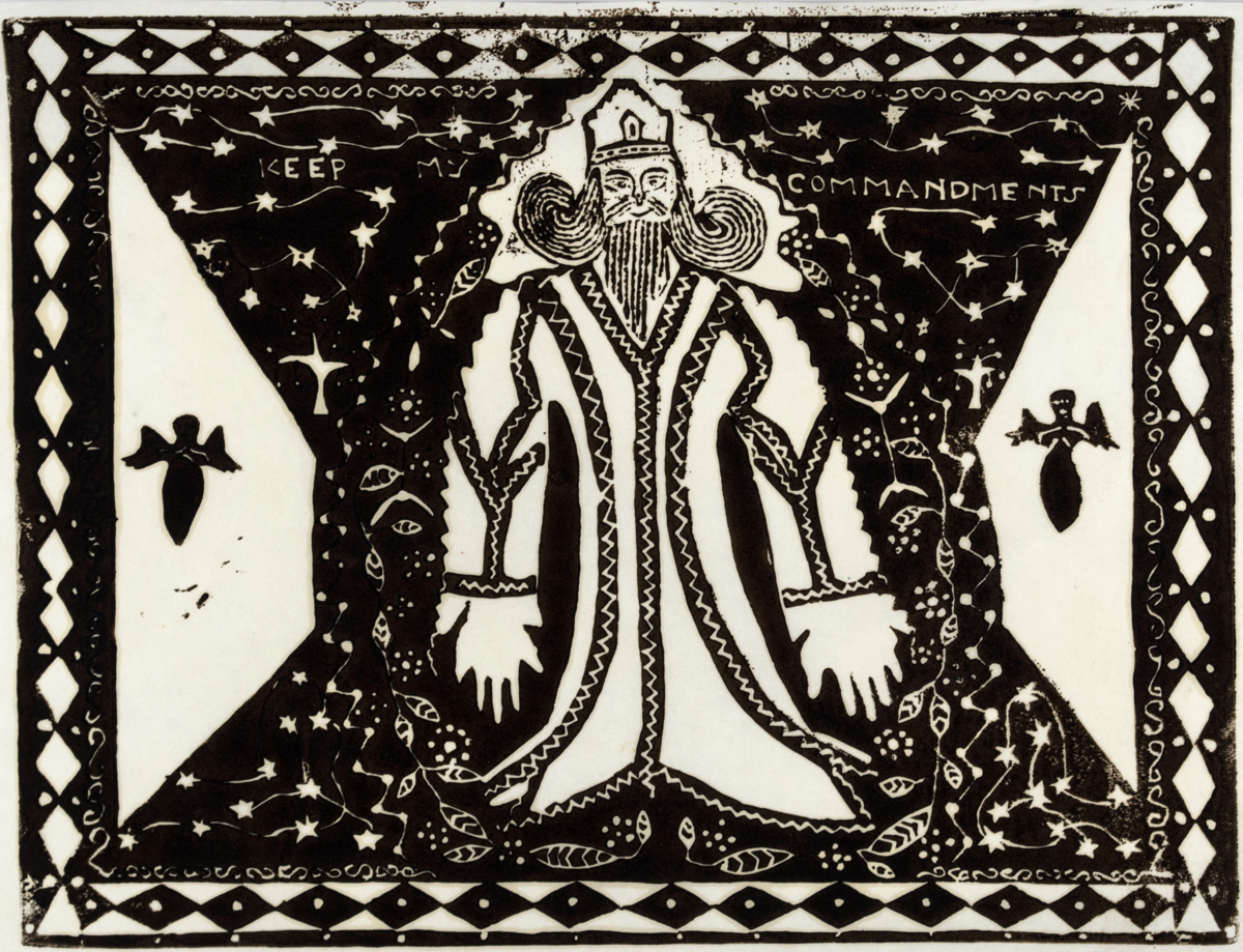 Linocut by Azaria Mbatha titled 'Keep my commandments', 1962. Edition: unnumbered. Signed and inscribed: 'Azaria Mbatha'. Foxing along the edges and creased on the right hand side. Unevenly printed on pane. Condition: Good.