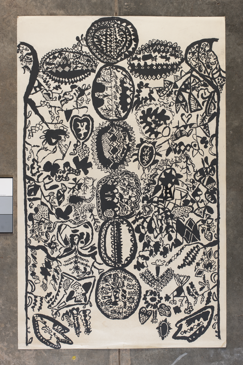 Noted as 'A series of tapestries of embellished organic forms resulted from encounters with designs in the textile-printing workshop, which was chiefly staffed by women. One was Goodness Mdluli’s As beautiful as can be (c.1973) [Fig. 5.8a], designed for repeat-printing by means of a silkscreen onto lengths of fabric. A screenprint of the basic design was given to Ester Nxumalo and Philda Majozi to develop in the loom'.
