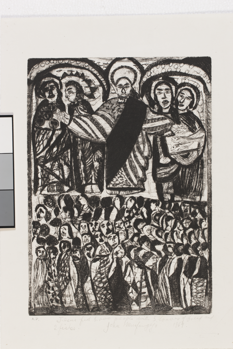 print; etching; aquatint; drypoint - Etching, aquatint and drypoint by John Muafangejo titled 'Jesus fed 5,000 people with 5 loaves of bread and 2 fishes', 1969. Edition: Artist's Proof. Condition: Good.