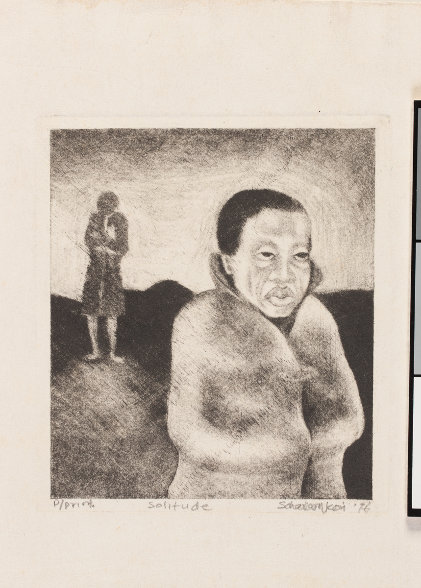 print; mezzotint - Mezzotint by Sokhaya Charles Basil Nkosi titled 'Solitude', 1976. Edition: Proof print. Signed, inscribed and dated: 'P/print Solitude S Charles Nkosi '76'. Pin holes on corners and dirt marks long the edges and sides. Condition: Fair.