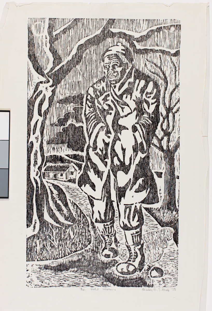 Woodcut by Sokhaya Charles Basil Nkosi titled 'The cold season', 1975. Edition: unnumbered. Signed inscribed and dated: 'The Cold Season Charles B.S. Nkosi '75.' Edges creased and torn above bottom right corner. Rip in the top centre. Condition: Fair.