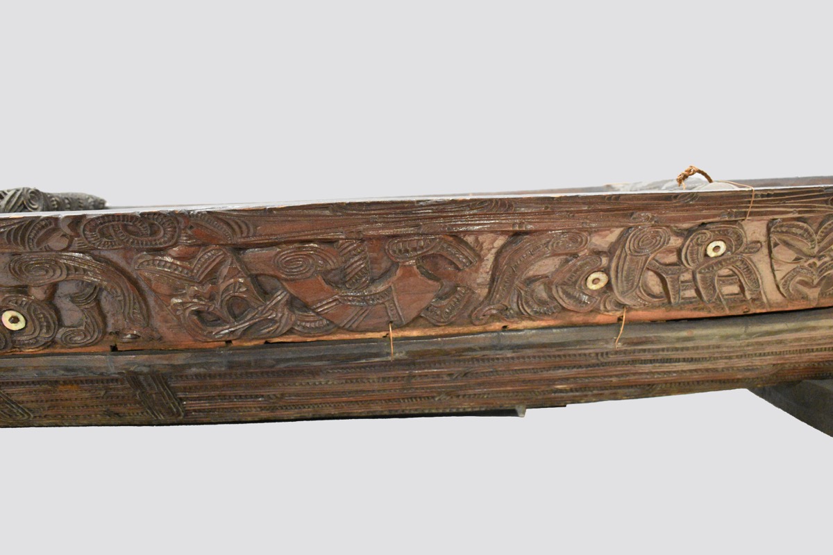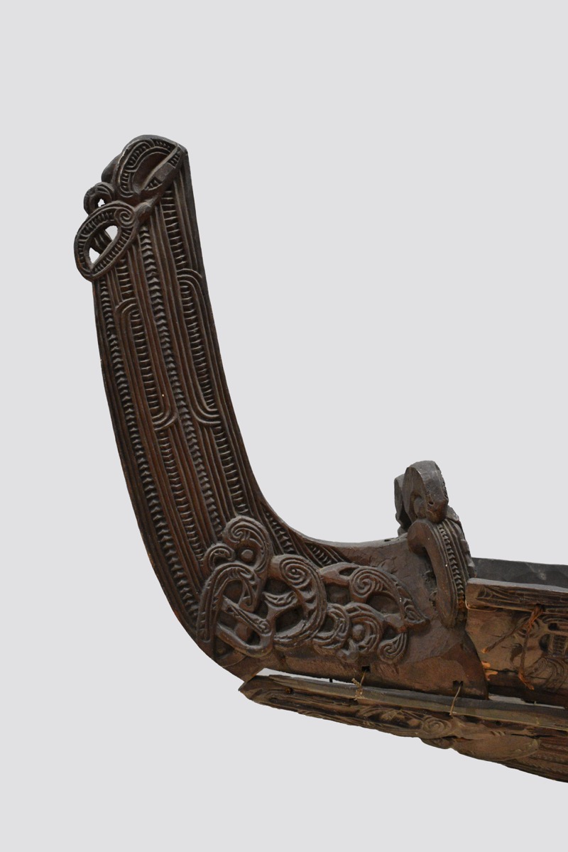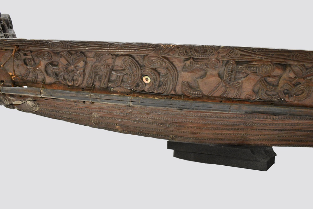 Model waka taua. A model war canoe made from wood. The canoe has been constructed from a solid base section, side panels lashed to the base with plant fibre, and four taumanu cross beams. The outside of the canoe including the hull and the taumanu have whakarare carvings. Both sides of the canoe are carved with manaia figures. The taurapa, stern post, is carved with whakarare carvings and figures. The tauihu, prow, is carved with a male face. Some of the carved figures have pāua shell (haliotis) eyes.