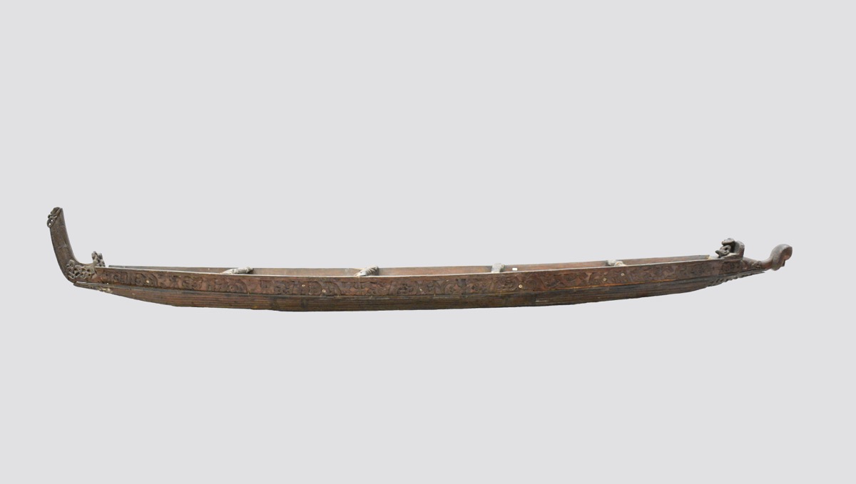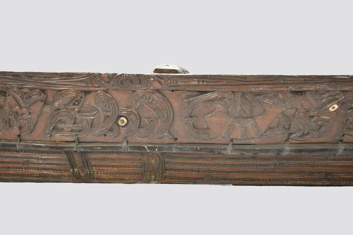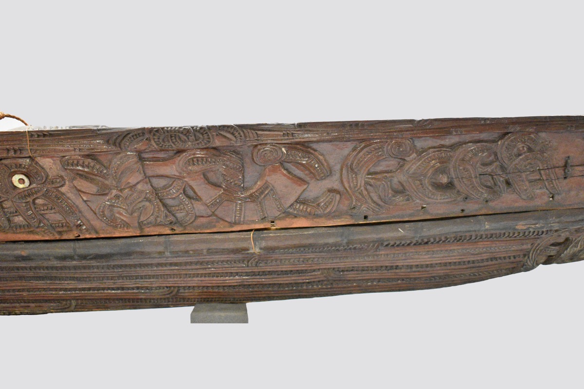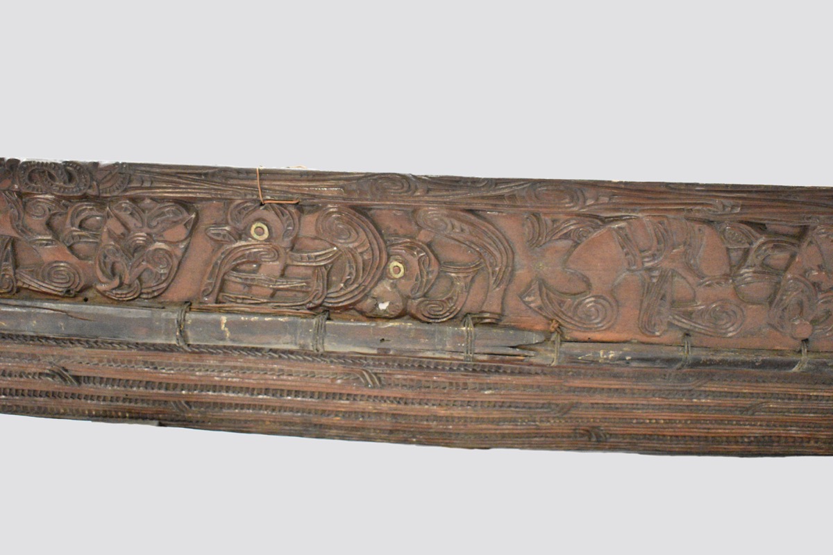 Model waka taua. A model war canoe made from wood. The canoe has been constructed from a solid base section, side panels lashed to the base with plant fibre, and four taumanu cross beams. The outside of the canoe including the hull and the taumanu have whakarare carvings. Both sides of the canoe are carved with manaia figures. The taurapa, stern post, is carved with whakarare carvings and figures. The tauihu, prow, is carved with a male face. Some of the carved figures have pāua shell (haliotis) eyes.