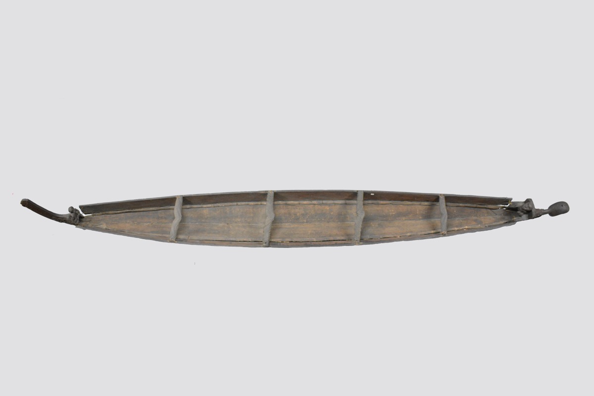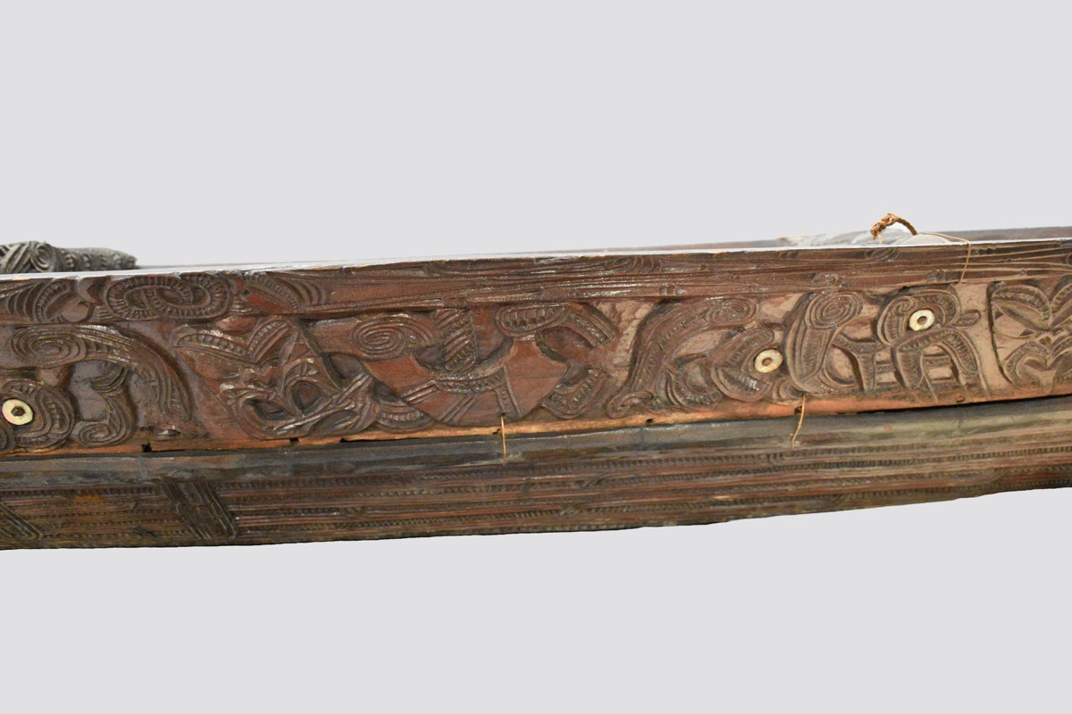 Model waka taua. A model canoe made from wood. The canoe has been constructed from a solid base section, side panels lashed to the base with plant fibre, and four taumanu cross beams. The outside of the canoe including the hull and the taumanu have whakarare carvings. Both sides of the canoe are carved with manaia figures. The taurapa, stern post, is carved with whakarare carvings and figures. The tauihu, prow, is carved with a male face. Some of the carved figures have pāua shell (haliotis) eyes.