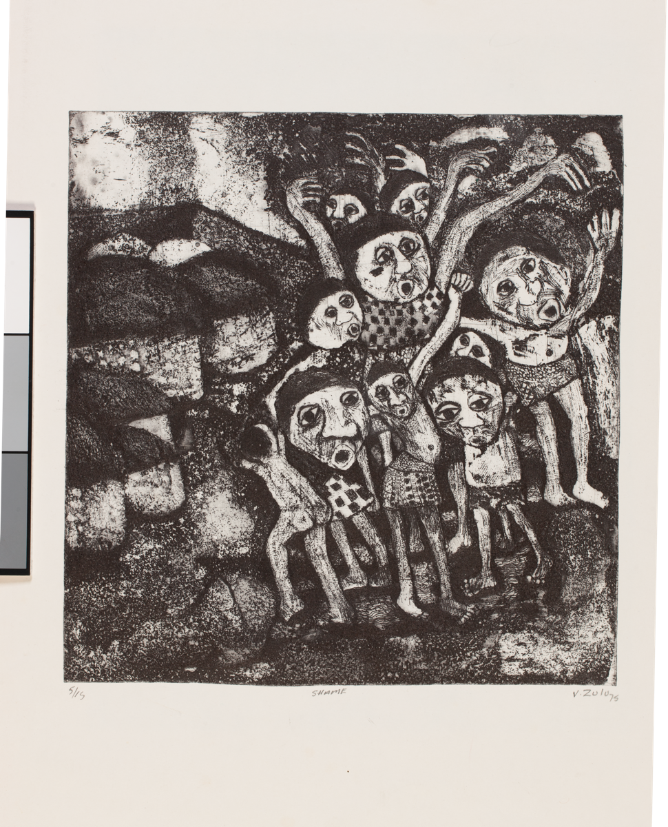 print; etching; aquatint - Etching and aquatint by Vuminkosi Zulu titled 'Shame', 1975. Edition: 5/15. Condition: Good.