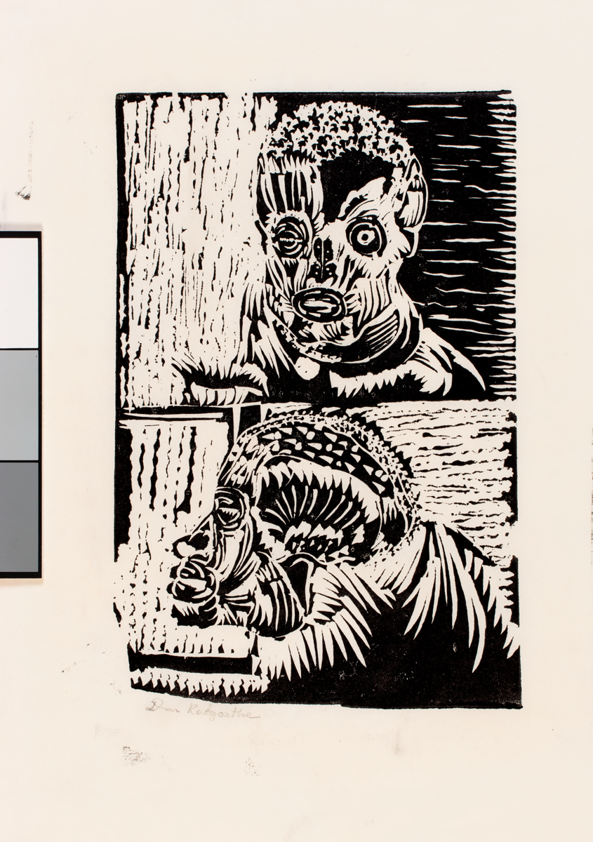 Linocut by Daniel (Dan) Sefudi Rakgoathe untitled (Portrait profile as a prophet), 1967/1968. Edition: unnumbered. Signed: 'Dan Rakgoathe' in the artist's youthful handwriting. Condition: Fair. Ink marks on edges and a tear in the left centre.