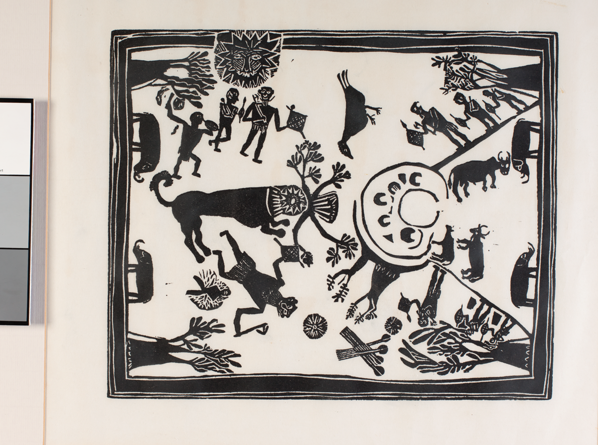 Only about four or five different linocut images made by Tabete are known to have survived. Other copies of it appear in a private collection in South Africa, the ELC Collection, the Sellman collection, and apparently in the Volkekunde Museum in Germany.