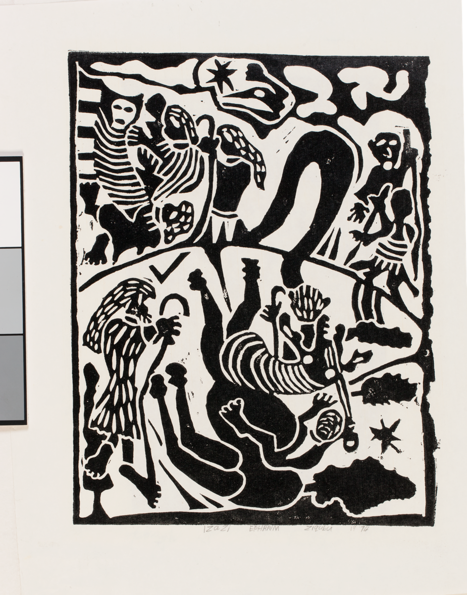 print; linocut - Linocut by Ephraim Ziqubu titled 'Izazi', 1974. Edition: Unnumbered. Signed, dated and inscribed: 'Izazi Ephraim Ziqubu 19 '74'. Condition: Good. Paper tag for mounting unevenly placed/printed on paper. Creases lower right and lower left.