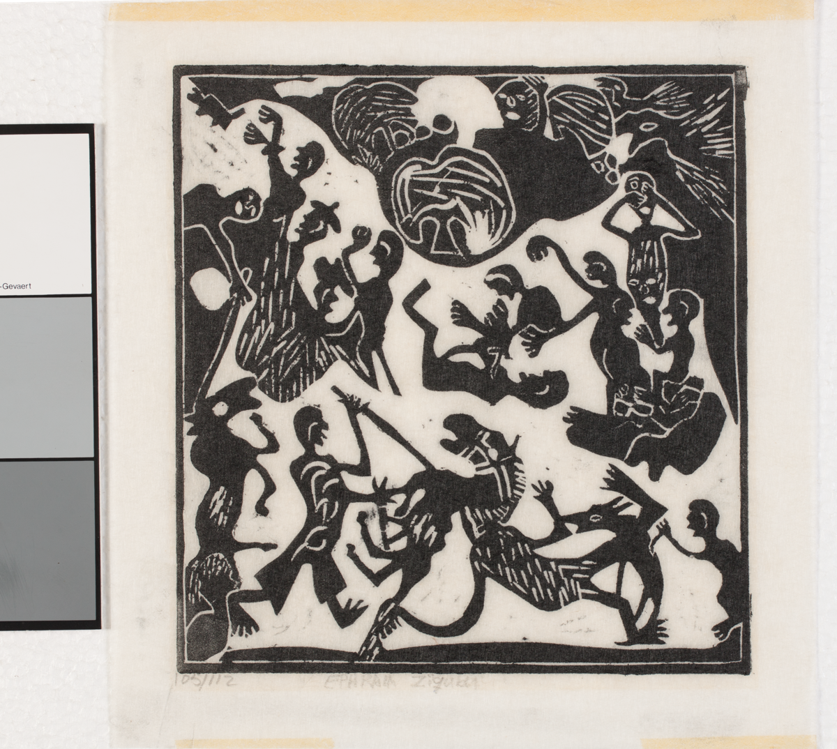 print; linocut - Linocut by Ephraim Ziqubu of an untitled fight (a battle long ago), undated (before April 1972). Edition: 105/112. Signed dated and inscribed: '105/112 Ephraim Ziqubu untitled'. Condition: Fair. Some repair is required to the borders. Marks along the edges from the mount.
