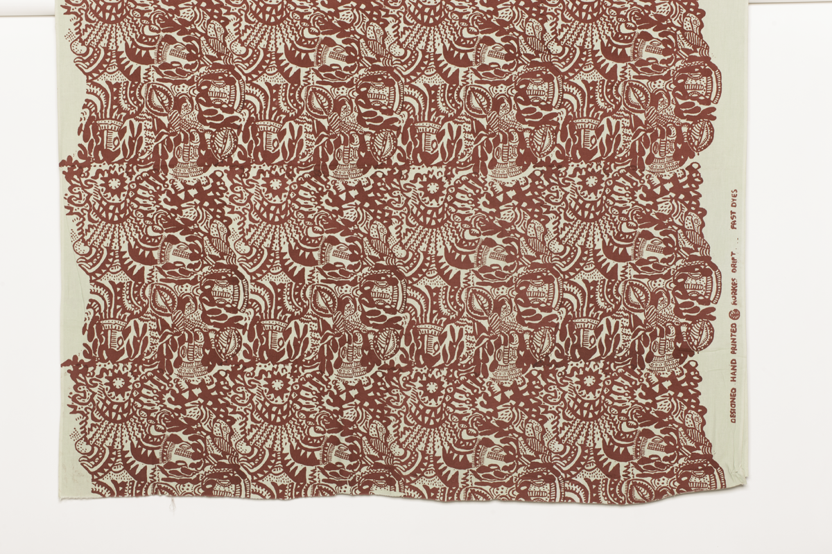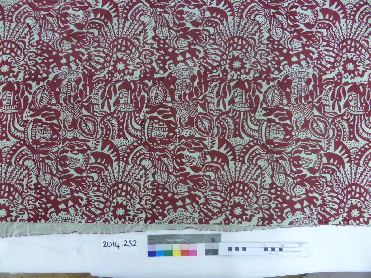 Screen-printed fabric of a red abstract or zoomorphic design printed on light green by unknown Rorke's Drift artists.