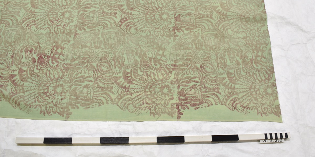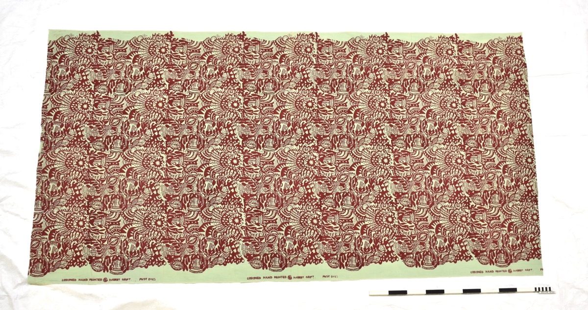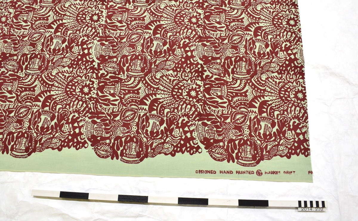 Screen-printed fabric of a red design printed on light green by unknown Rorke's Drift artists. Undated, but said to be post 1982.