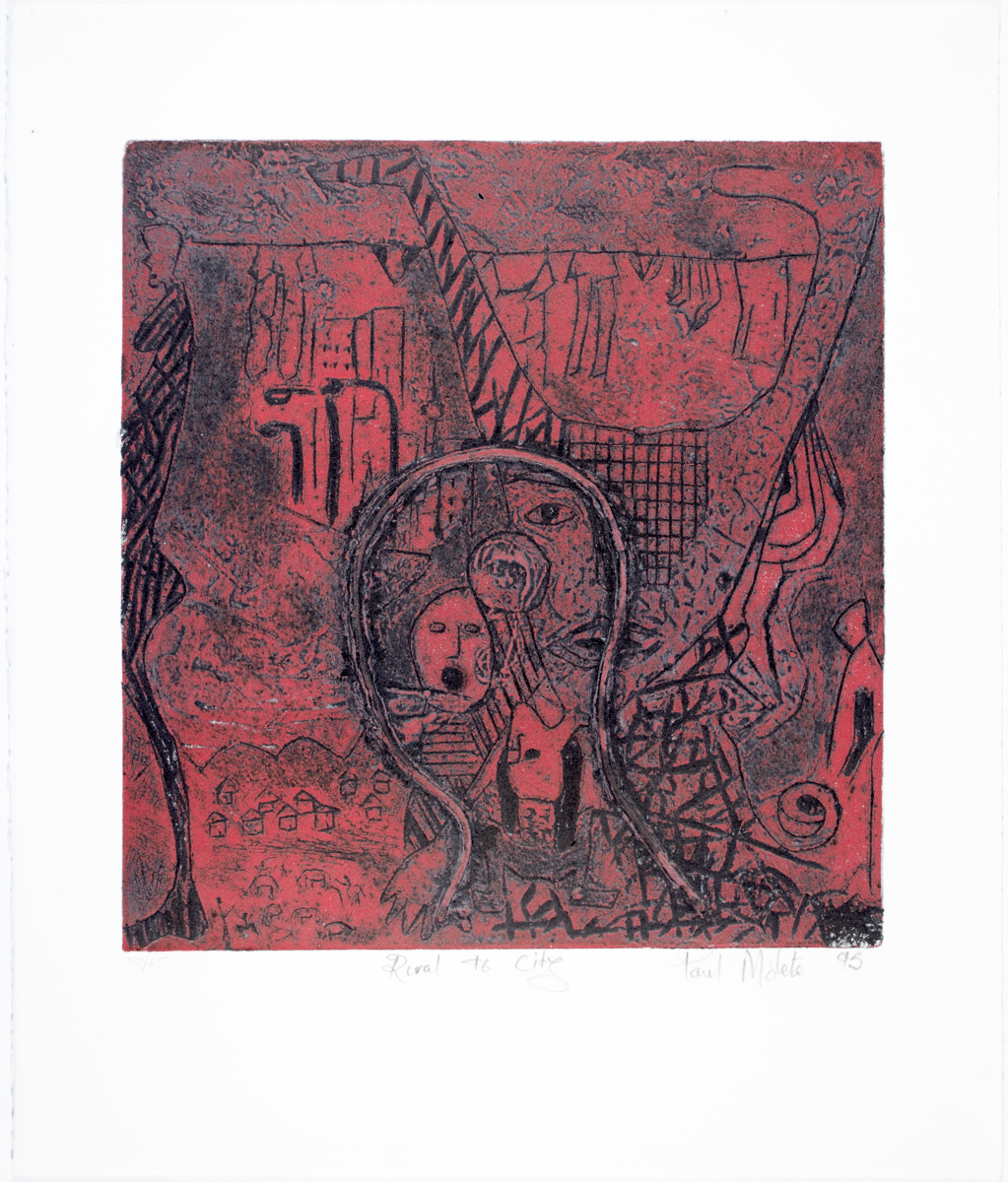 print; etching - Etching by Paul Molete titled 'Rural to City', 1995. Edition: 50/65. Inscribed, signed and dated: '50/65 Rural to City Paul Molete 95'. Condition: Good. Part of the Volatile Alliances 1995 portfolio, edition 50/65.