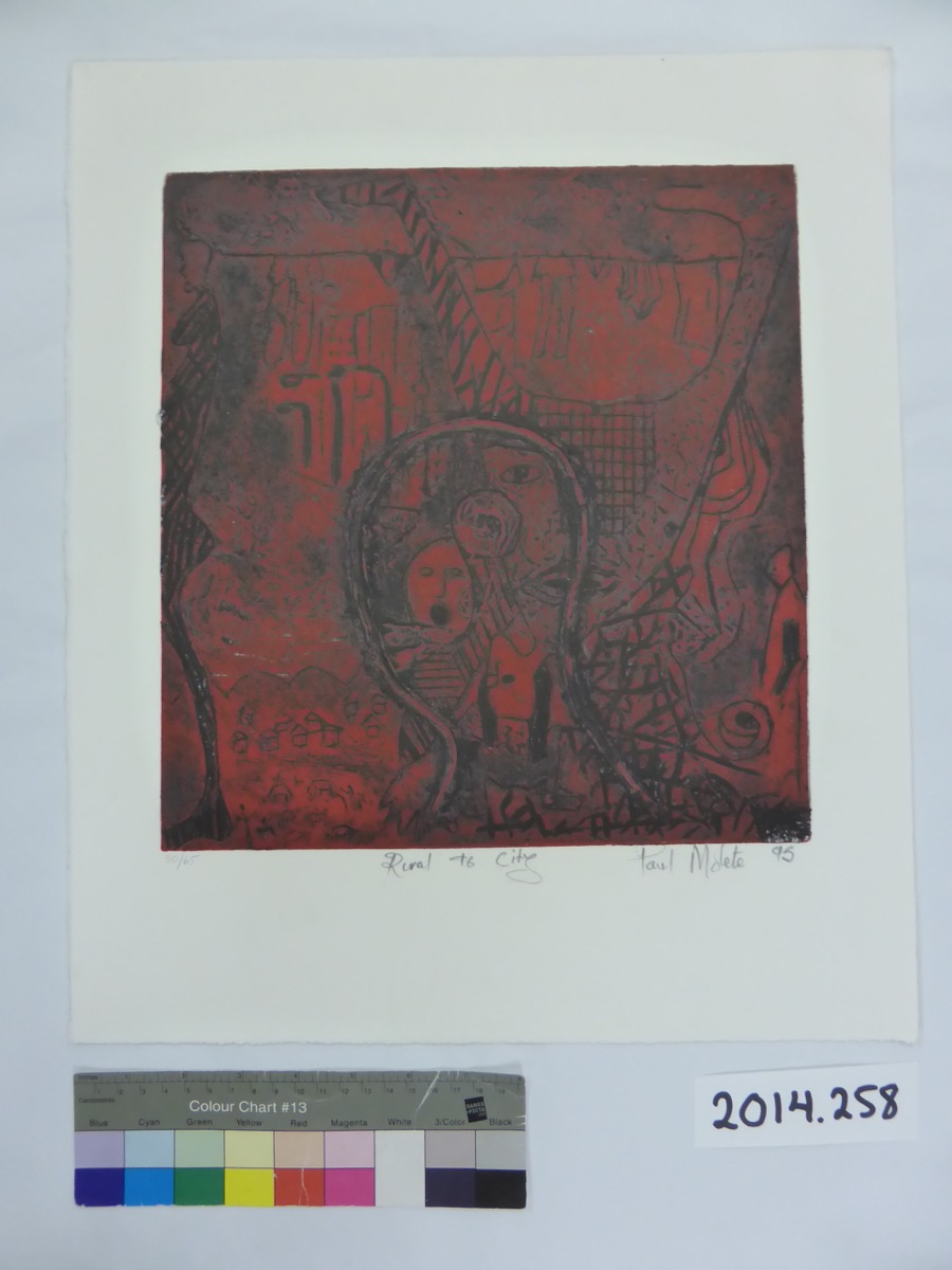 Etching by Paul Molete titled 'Rural to City', 1995. Edition: 50/65. Inscribed, signed and dated: '50/65 Rural to City Paul Molete 95'. Condition: Good. Part of the Volatile Alliances 1995 portfolio, edition 50/65.