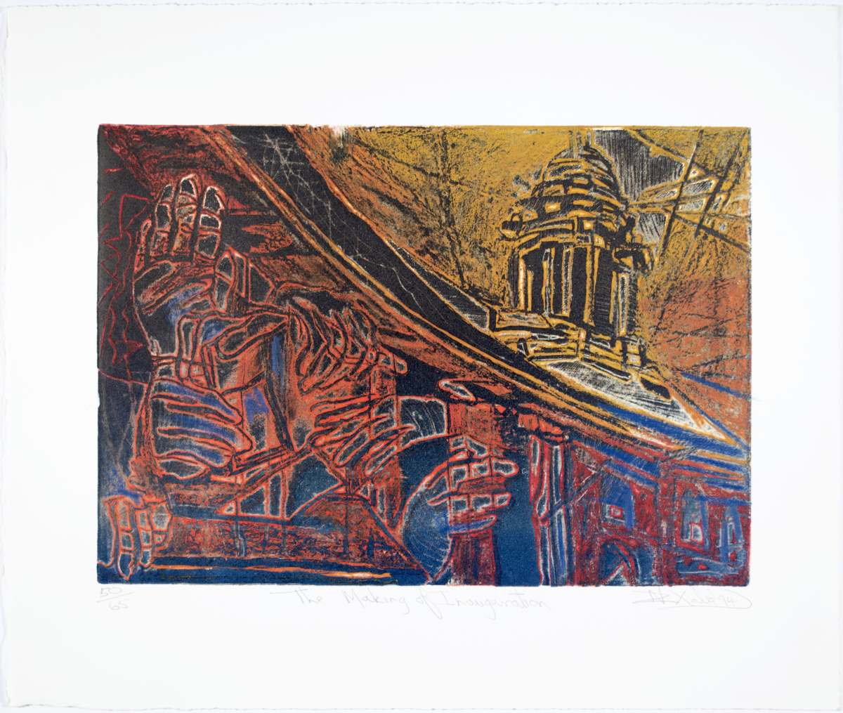print; etching - Etching by Xaba Nhlanhla titled 'The making of inauguration', 1994. Edition: 50/65. Inscribed signed and dated: '50/65 The Making of Inauguration [Autograph] 94'. Condition: Good. Part of the Volatile Alliances 1995 portfolio, edition 50/65.