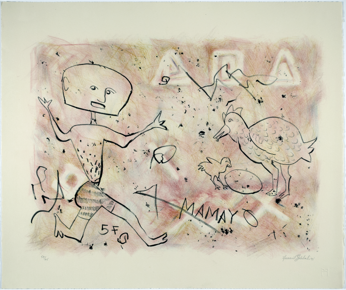 Part of the Portfolio 'Volatile Alliances', 1995 with 23 prints (2014.258 - 2014.280), edition 50/65 (though this is the only print with a different edition number, 63/65). Participating artists included Paul Molete, Gordon Gabashane, Nhlanhla Xaba, Joe Ndlovu, Simon Mthimkhulu, Ezekiel Budeli, Pepe Jose Abela, Mmakgabo Helen Sebidi, Philippa Hobbs, Dominic Tshabangu, Giulio Tambellini, Moleleki Frank Ledimo, Lothar Riedel, Mbongeni Richman Buthelezi, Velaphi Mzimba, Elvin Sefati Nethononda, Sokhaya Charles Nkosi, Vincent Baloyi, Simon Sejake, Durant Sihlali, Diane Victor, Muzi Donga and Kim Berman.