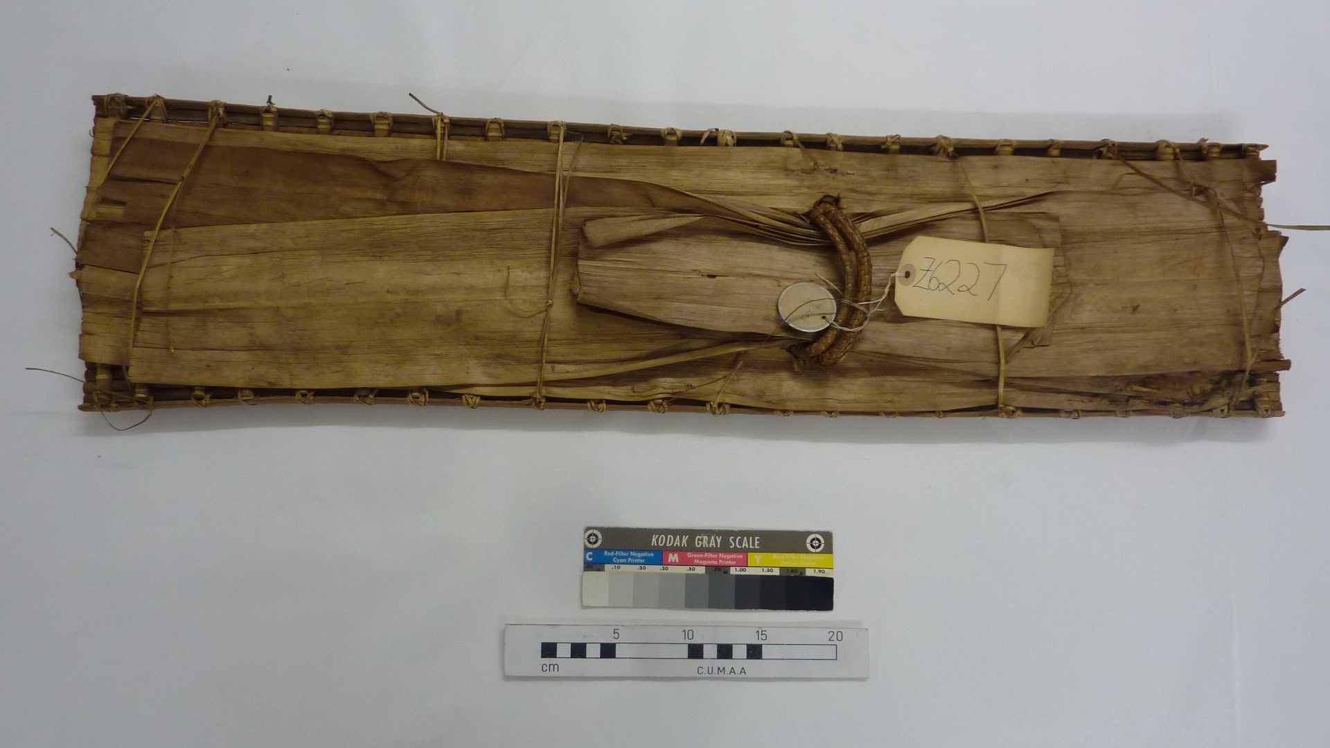 Catalogue card Z 6227 reads [typed in black ink:] 'Z 6227 Solomon Islands/Melanesia/Shield made of wooden sticks riveted together with native fibre/ (O.VI.25.1.M)'. Red circular sticker adheres to top right corner of catalogue card.