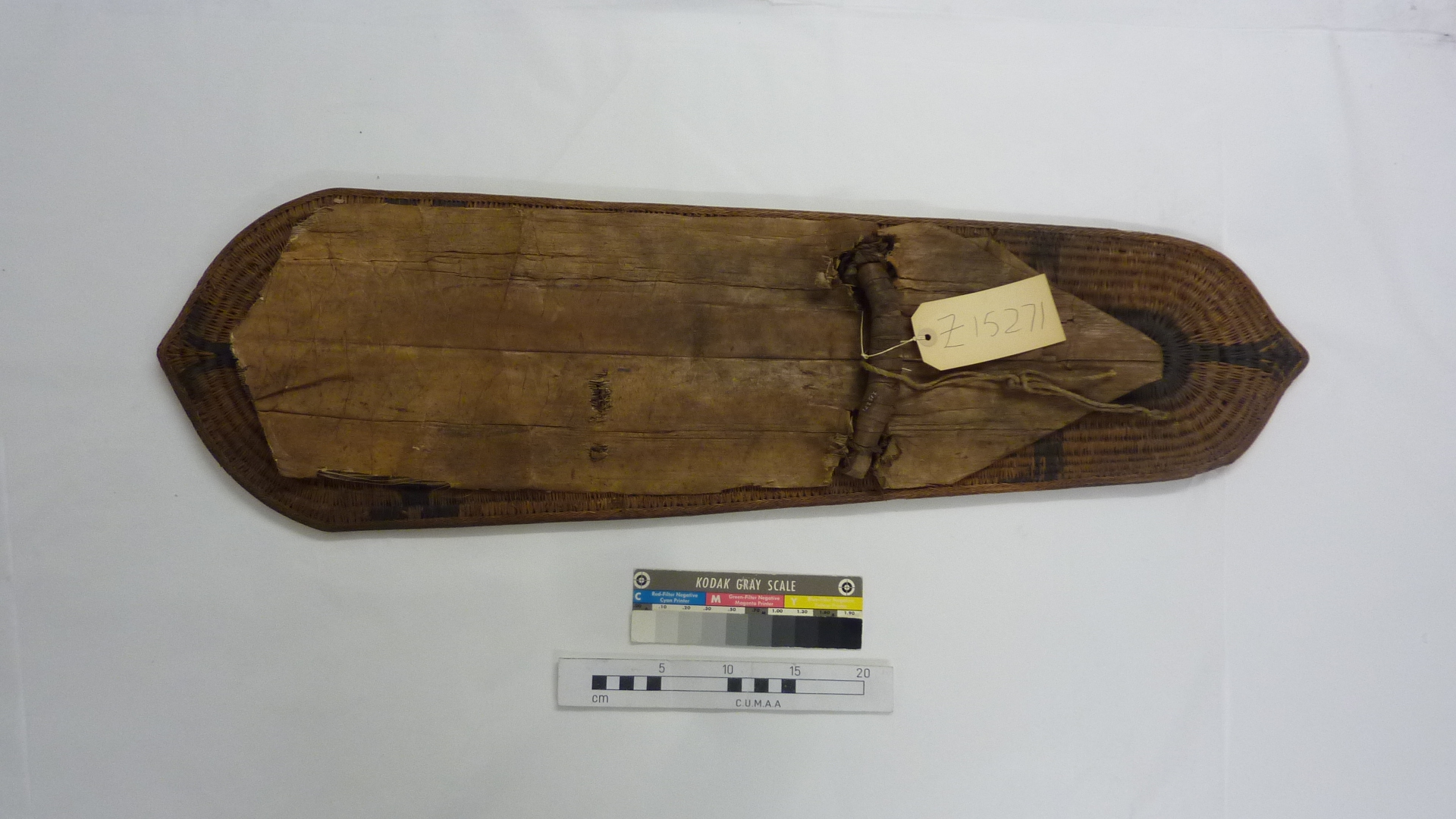 Catalogue card Z 15271 reads [typed in black ink:] 'Z 15271 Melanesia: Solomon Islands/ Basketwork *shield, with patterning in black./ On inner side a guard made from part of/banana stem. Attached ornament made of/feathers, worked into a round ball which is/ fastened to the end of a spike./ Shield c. 2' 10'' long./ * coiled basketry technique, with the sewing strips/ interlocking with the strips of previous coil./The coils are flat, varying in width from 1/4'' on/ outer rim to 3/4'' in centre.' Red circular sticker adheres to top right corner of catalogue card.