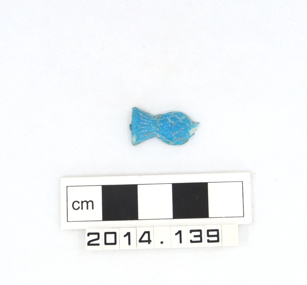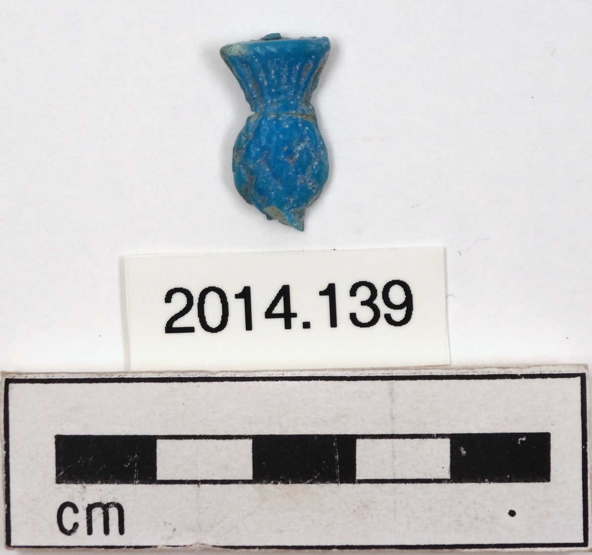 Bright blue faience pendant in the form of a cornflower. Base, with suspension loop, broken away and missing. Break between body and crown repaired.